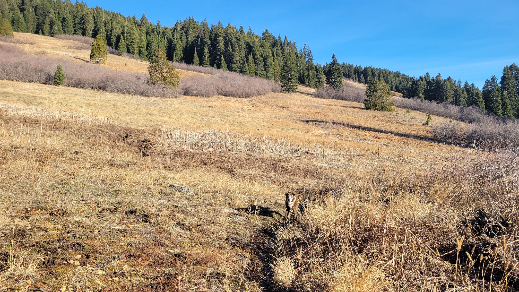 Lake mountain has been on my list for quite a while but for some reason I had the impression it was going to be much harder. I was waiting to do it with a partner for safety reasons but it ended up being a great day of just me and Maggie. It is a steep mountain but most of it is either trailed or open meadow until you get towards the very top. I made the mistake of going straight up not looking at my GPS satellite images and got very tangled up in the manzanita and buck brush. This is definitely not Maggie's favorite way to hike, sometimes refusing. However I went a different route coming down on the west side that is more open and basically just dirt, no brush. It is a very steep climb the last 1/3-1/2 mile where you have to ascend about 700'. It was very worth it and an enjoyable hike despite the challenge.