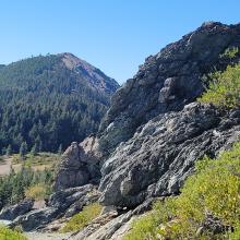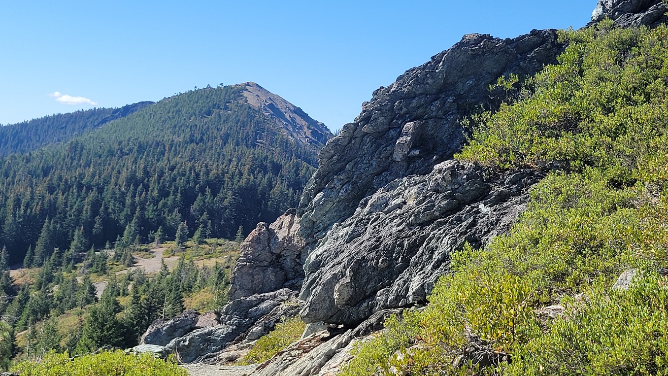 I hiked to White Mountain in a hurry in a race against sundown, we still needed to find a place to pitch a tent for the weekend before CQP started. It was a very pleasant hike and I wish I had more time. Most of the trek is on the PCT until you climb the final 400' up to the peak. The trail is beautiful, well forested and lots of great views and interesting rock formation. White is basically a bare rock mountain to the north consisting of milky green rock, maybe serpentine?, so it is white in appearance from a distance. When I got to the top I had some technical issues, my KX2 would not power. I was able to get power thru the internal jack luckily and was able to get some qsos but didn't have much time.