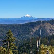 Best way to get to and hike Woodrat in my opinion is to take Sterling Creek Rd (several ways to get to Sterling depending on where you are coming from) and eventually turn on Woodrat Mt Rd 38-2-29. There is a sign and the road is paved most of the way. You will come to an intersection on the right where Bishop Cr meets Woodrat, keep going up Woodrat for another 3-4/10ths of a mile and there will be a rutty off road embankment on the left 42.22318,-122.98933. You'll have to find a pullout before or after to park. Climb up the bank and go to the right straight up the hill on the old road current dirt bike road. This is steeper but a lot easier hike than starting at the paragliding take off area and trying to stay upright through rock and brush.
