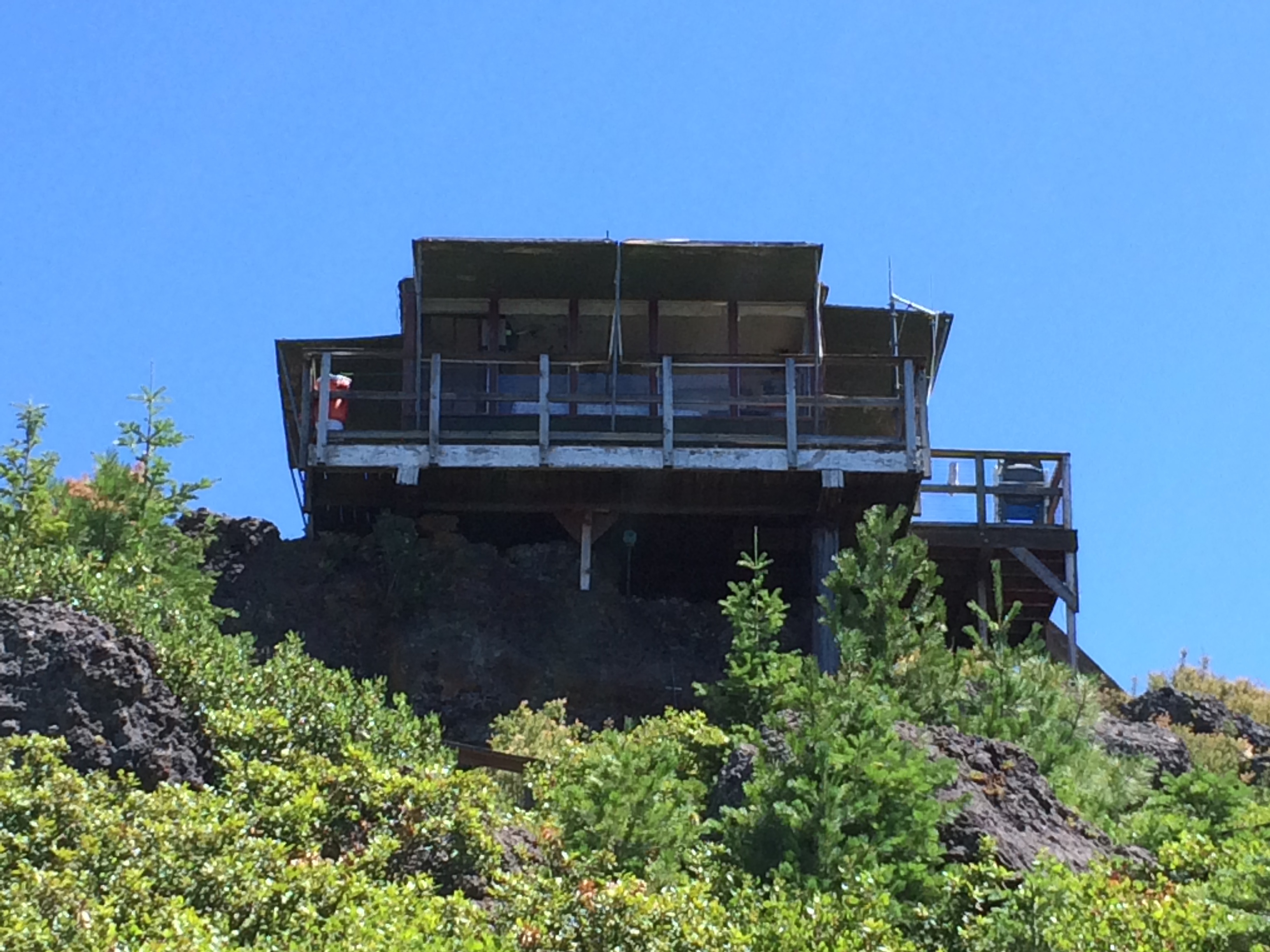 The ranger who was manning the tower was very friendly and invited me up for a tour. His name was Joe, and if you decide to activate this summit during fire season feel free to bring him a cold beer. Anyway, he showed me around the tower, even inviting me inside. Due to my limited time on the summit I had to cut the tour short so I told him my true motivation for being there. He was quite interested in my pursuit and offered to let me set up my gear right there on the tower. Cool! I connected a speaker instead of my usual headphones and he sat there and watched me operate. He said that he's seen geocachers up there before but obviously this was his first time seeing a ham. It was a very enjoyable visit and I regretted not having more time to spend with him. He offered me a gatorade on the way out when I told him my wife accidentally took my water bottle when I dropped her off at the beach.