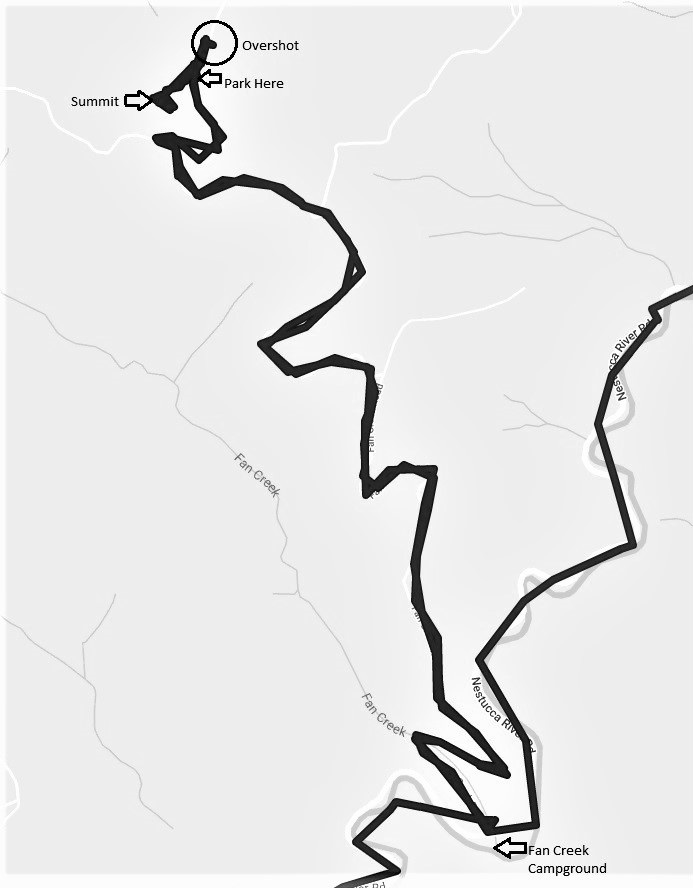 The turn from Nestucca River Byway onto the gravel road heading North toward Dovre Peak is directly across from the small Fan Creek Campground. The road is gravel but shouldn't be a problem for any but the lowest clearance vehicles. I initially drove past the trailhead to the summit, since the road is rather straight and flat at that point.
