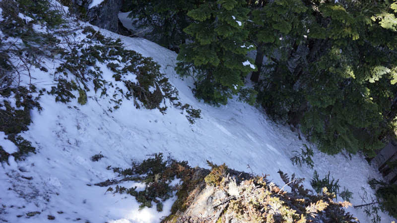 On my way down I choose a different route. I descend inside the forest. The slope even here is very steep, at least 45 degrees. Using my ice axe and hope that it will not end with a big rock wall. Luckily there is no wall here. As I got some elevation down I orient myself towards the saddle. So I go round those parallel narrow rock walls. Once I reach the saddle I am very happy. Danger is over. From here is all fun and laughter to get back to the car. On the picture is my route. Photo was taken 2 days after from Huckleberry Mountain.