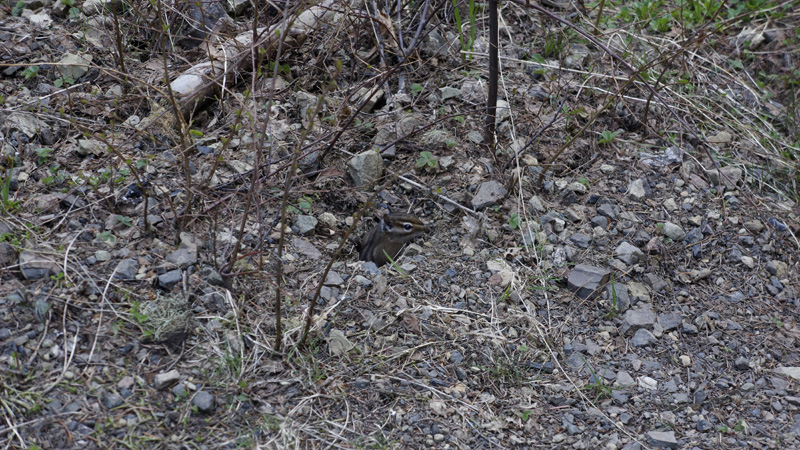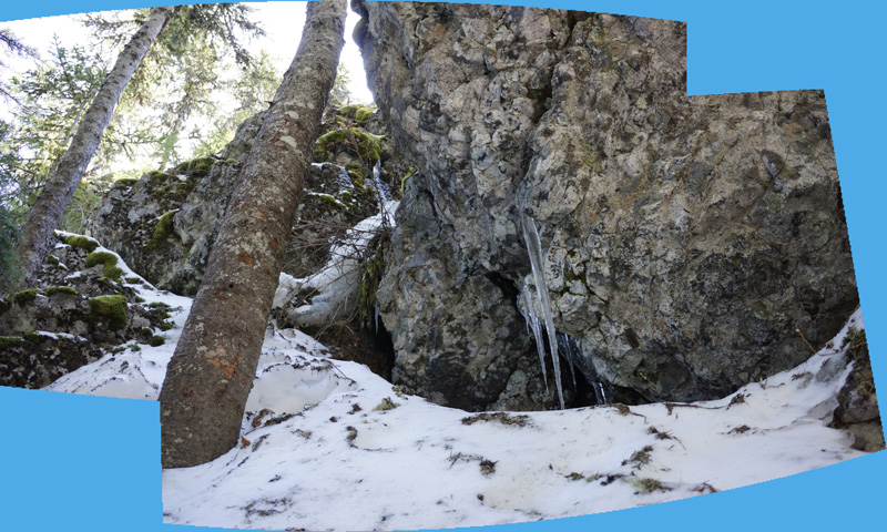 During my way down I try to stay in the forest longer. I cover my wound on my left hand with some resin. That has a very nice smell. The snow outside of the forest is very slushy and I am sinking sometimes up to my knees. Once I reach the open area I swap the crampons to snowshoes. A chipmunk next to a forest road.