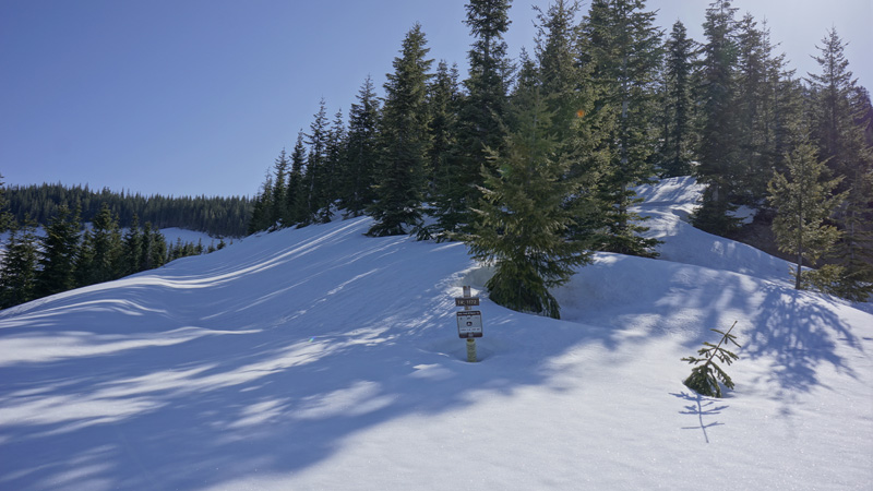 Made a good progress on the snow covered forest road and soon reached the ridge line. Off course I hardly had to walk any serious distance and there was no significant elevation gain either, so this fast progress is understandable. This is exactly what I wanted. Get out and have only a short distance walk and some QSOs. Well, it turned out a little different. There are pine trees in the middle of the picture. To left the Divide Ridge trail, which here goes below the ridge line. To right an old logging road. I am hiking in between staying on the ridge. Climbing the first summit, descend back to the col and climb the second peak which is the SOTA summit.