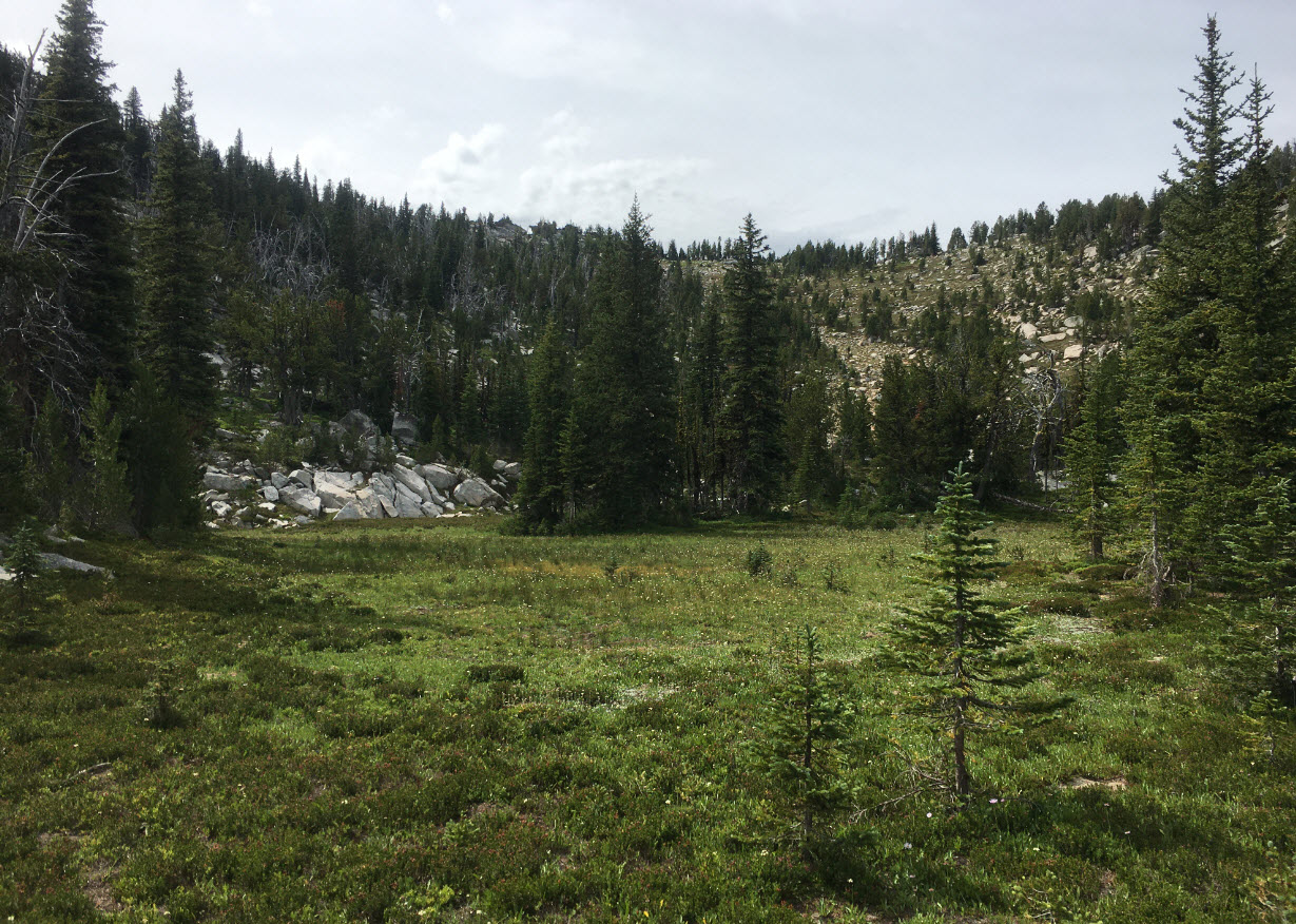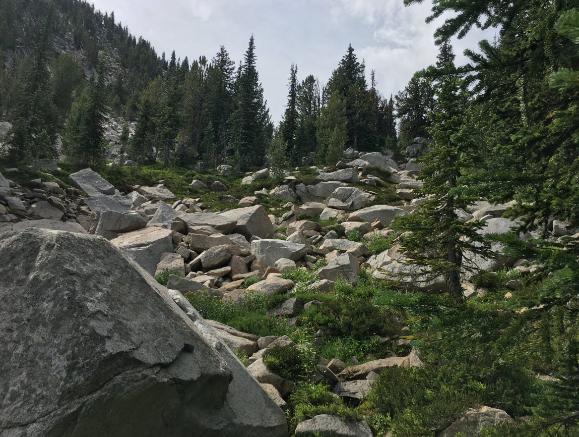 You will navigate through/around large boulder fields, but even in August the brush was not too thick, and you could walk through it as you navigated around the large boulders.  You will pass up through a series of stair steps towards the ridge. I found I had to be quite careful with my footing and the ascent is step in places.