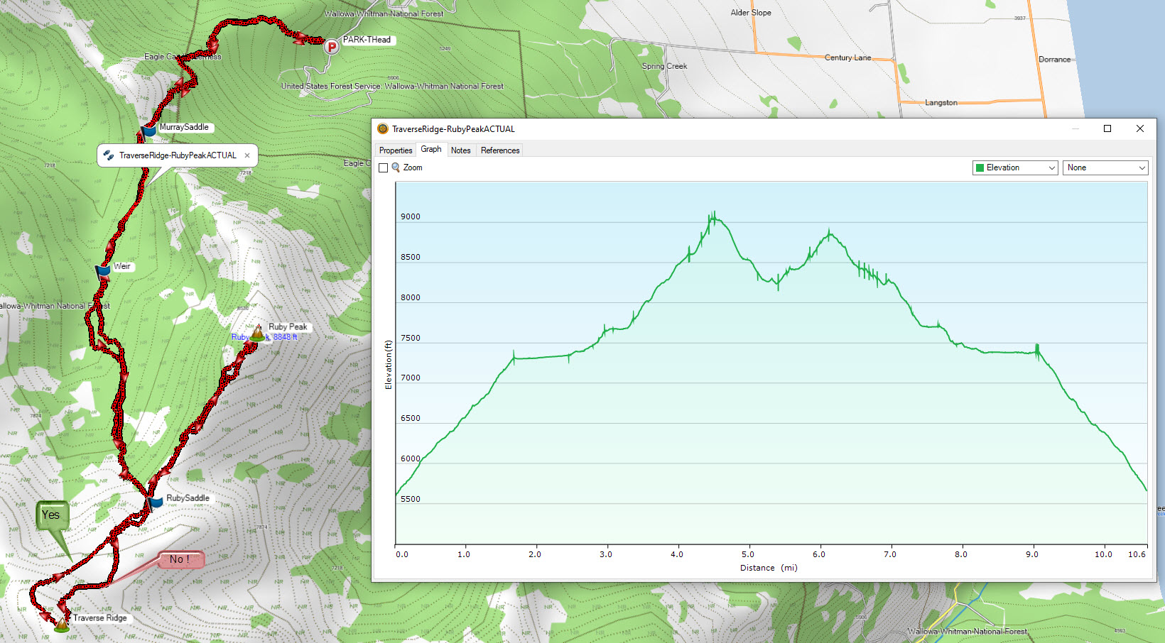 I made the mistake of a direct attempt at the summit from Ruby Saddle (see GPS track below for “NO”) It was quite a scramble and I lost a lot of time. I recommend staying to the right side of the summit and follow the ridgeline up. Much better route, I used it on the way down (see GPS track below for “YES”).