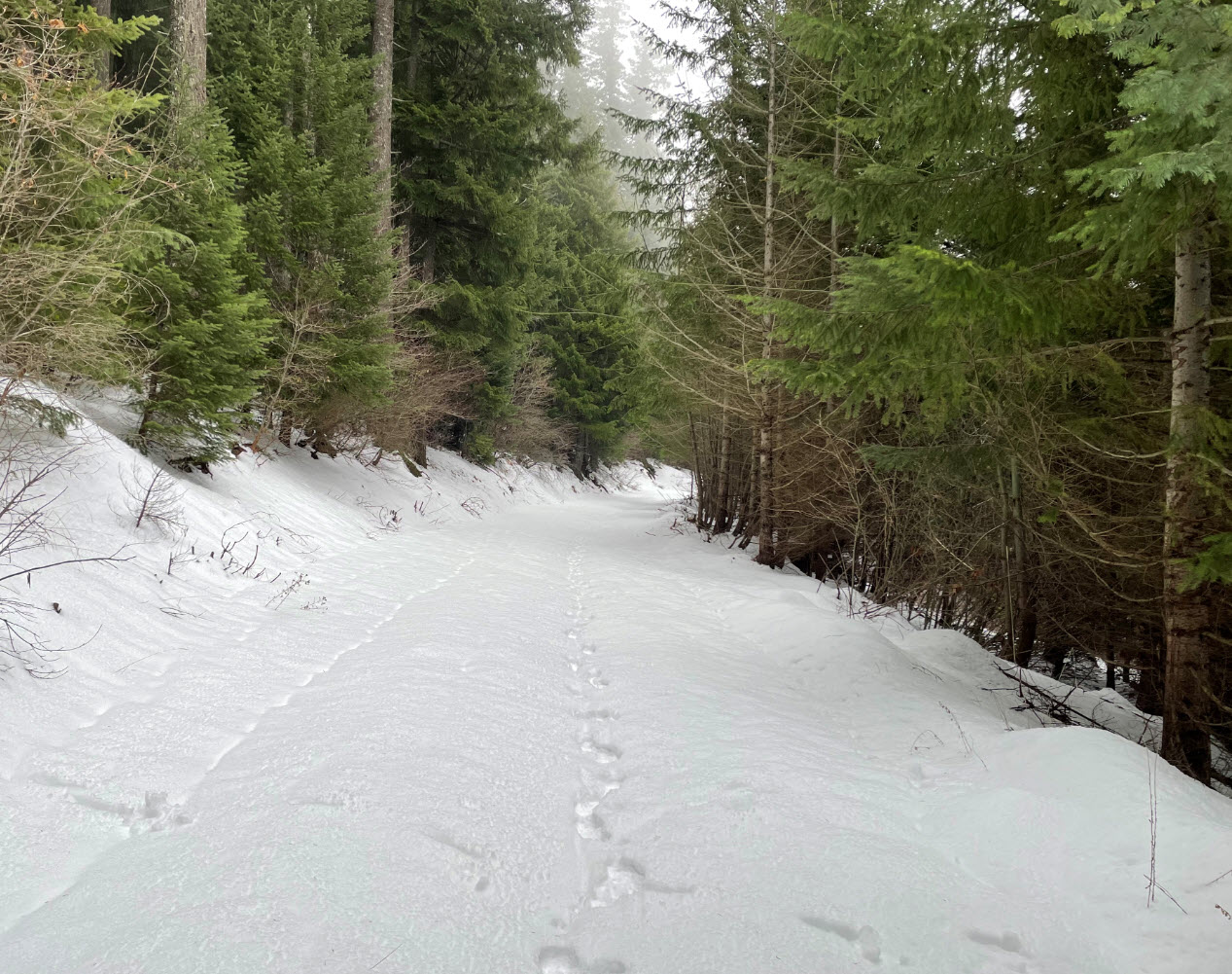 Underwood Mountain is a 2 pt summit Northwest of Underwood, WA across the river Northwest from Hood River Oregon. The start point is about 4.5 miles off of highway 14. It is an easy 3 mile hike to the summit with 1400 ft elevation gain on forest roads closed to motor vehicles. There is a short 250 foot doable bushwack to the summit. It would be a very feasible mountain bike activation. I hiked in late Dec on 3-6 inches of snow with microspikes, this would be a pleasant snow shoe activation and CC ski tracks were on the roads as well.
