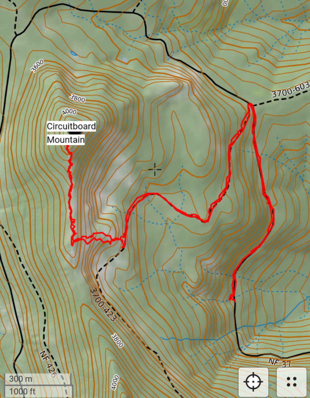Second, we expected a bushwhack of 500' from the saddle, but instead followed 3700-423 up from NF37, and bushwhacked from there. This route had substantially more distance than the original plan, but it was shorter than our planned route from the north.