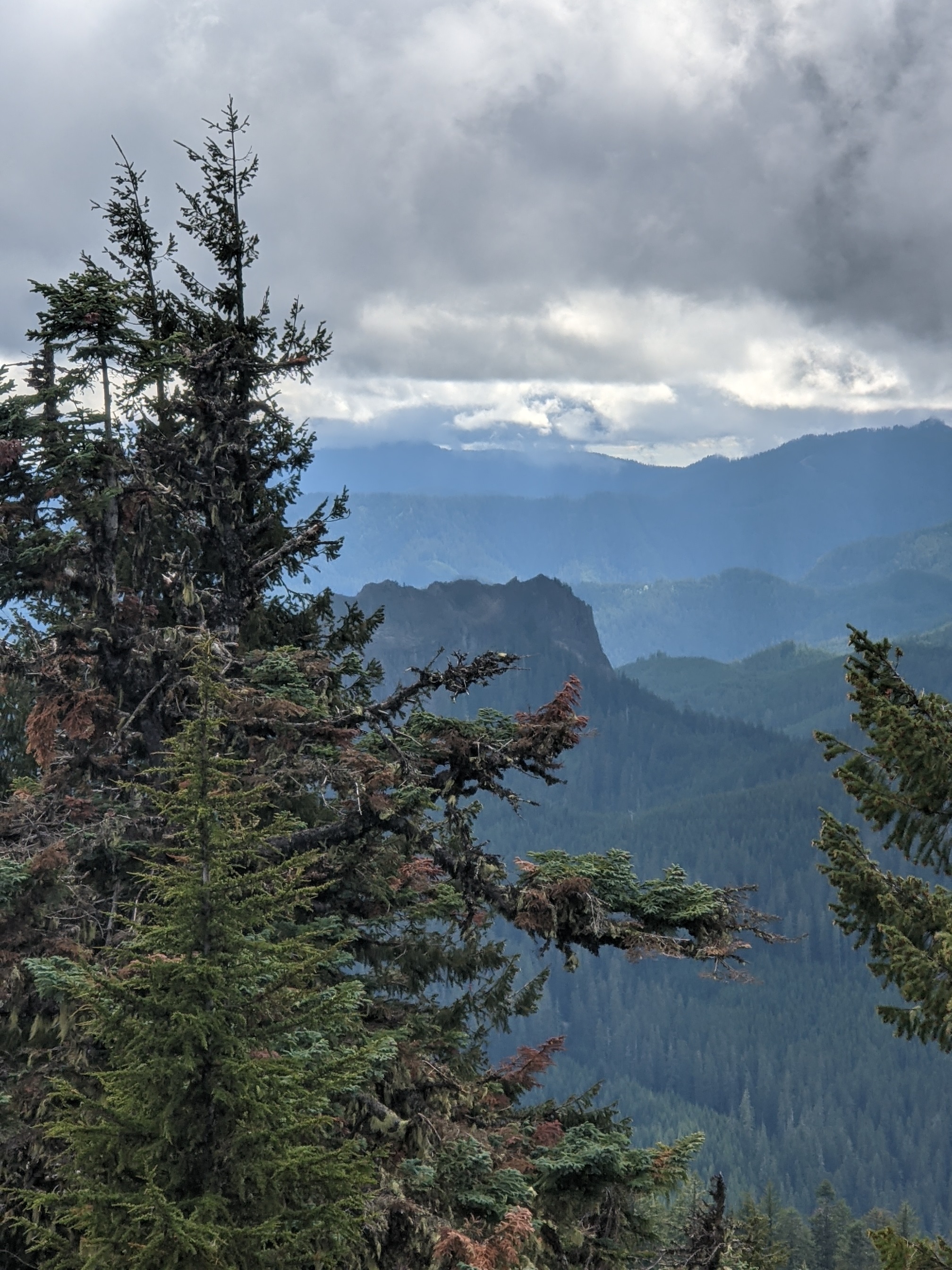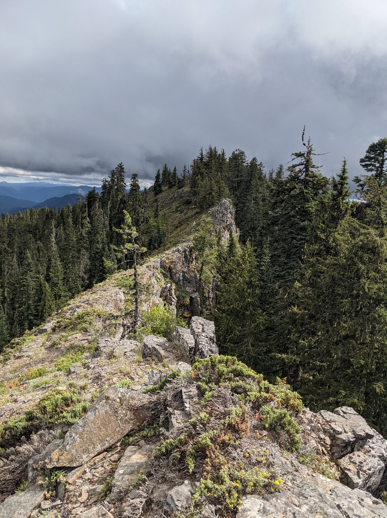Bunchgrass Mountain is a bushwhack through meadows of bear grass (presumably its namesake), and trees and brush up higher. It eventually reaches an unavoidable steep push to the AZ, which rewards you with impressive nearly panoramic views of Wolf Rock, Latiwi Mountain, and others to the east. This is across the road from Wildcat W7O/CM-082, and across the highway from Iron Mountain, so they make a good pair or trio if you have the time.