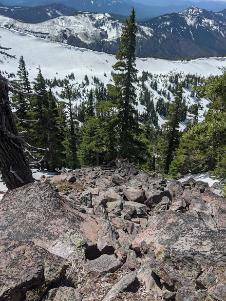 We trekked to the southern edge of the wedge-shaped prominence of Dinah-Mo, which shows up clearly on CalTopo's slope angle shading feature as the least steep way up - and I'm sure it is, but it's not easy. Even though after a very short approach we were almost entirely off snow, this is a twisted trek through trees and around snags, which on the west side is awkwardly steep and on the east side is all but a cliff. We just avoided being on the east side at all, and took whatever path we could see up the middle. We stopped about 60 vertical feet from the summit, in a sheltered group of rocks, because the remainder of the summit looked precarious, we were moving slower than we wanted, and the wind was pretty fierce, and I was able to manage summit-to-summit VHF FM contacts to South Saddle with my yagi, but nothing heard on any freq with a whip.