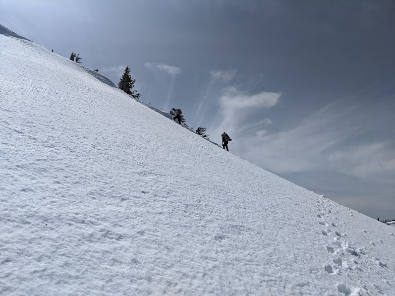 Fortune favored us, though, and we saw farther down the ridge a slope that looked quite a lot shallower, and viewing it from the top, it looked quite manageable to traverse, with essentially no cornice buildup and a very short run before the trees started - the top of the run is at 44.7400, -121.8357, and we glissaded straight down from there, then headed down and around a sort of secondary ridge protecting us from exposure to the rest of the more snow-laden ridge.