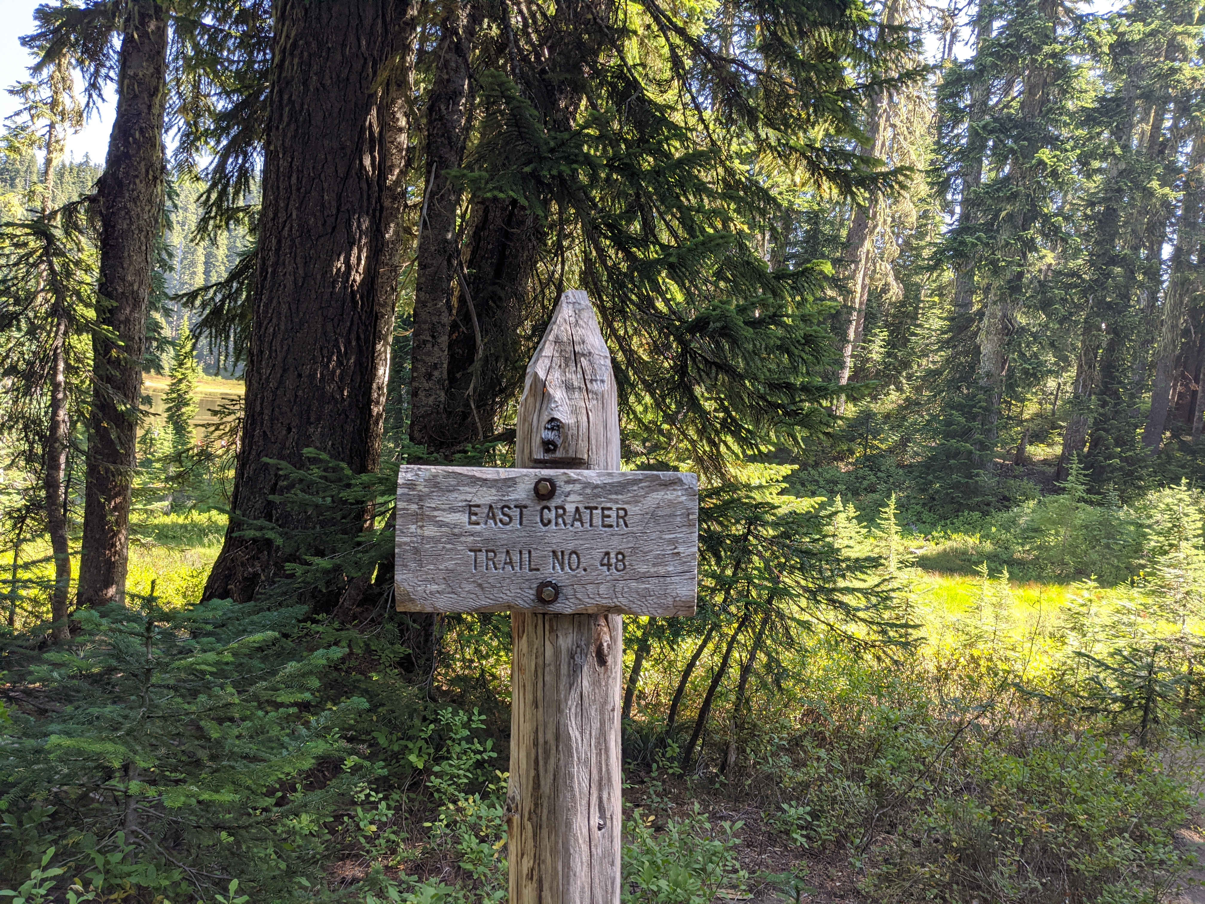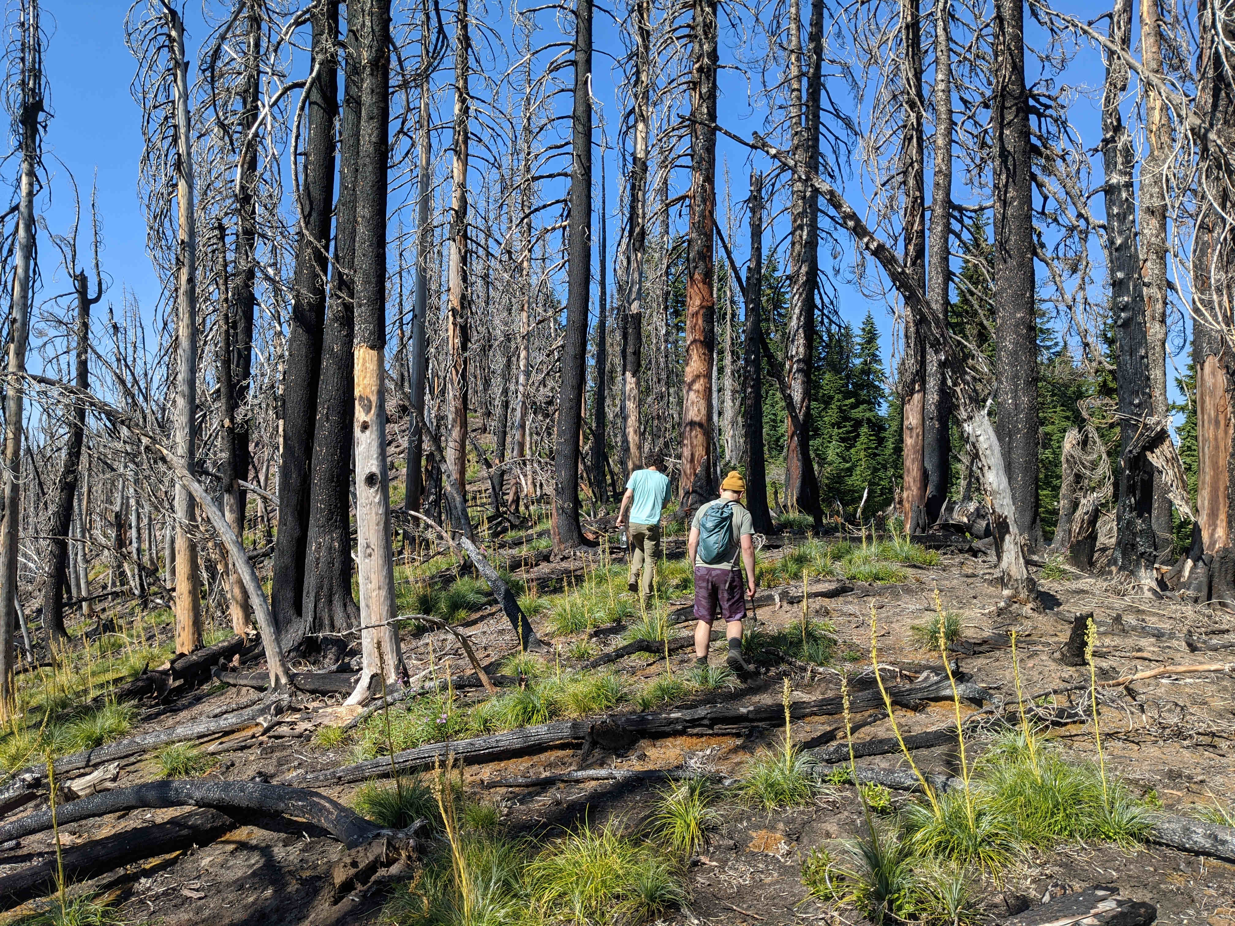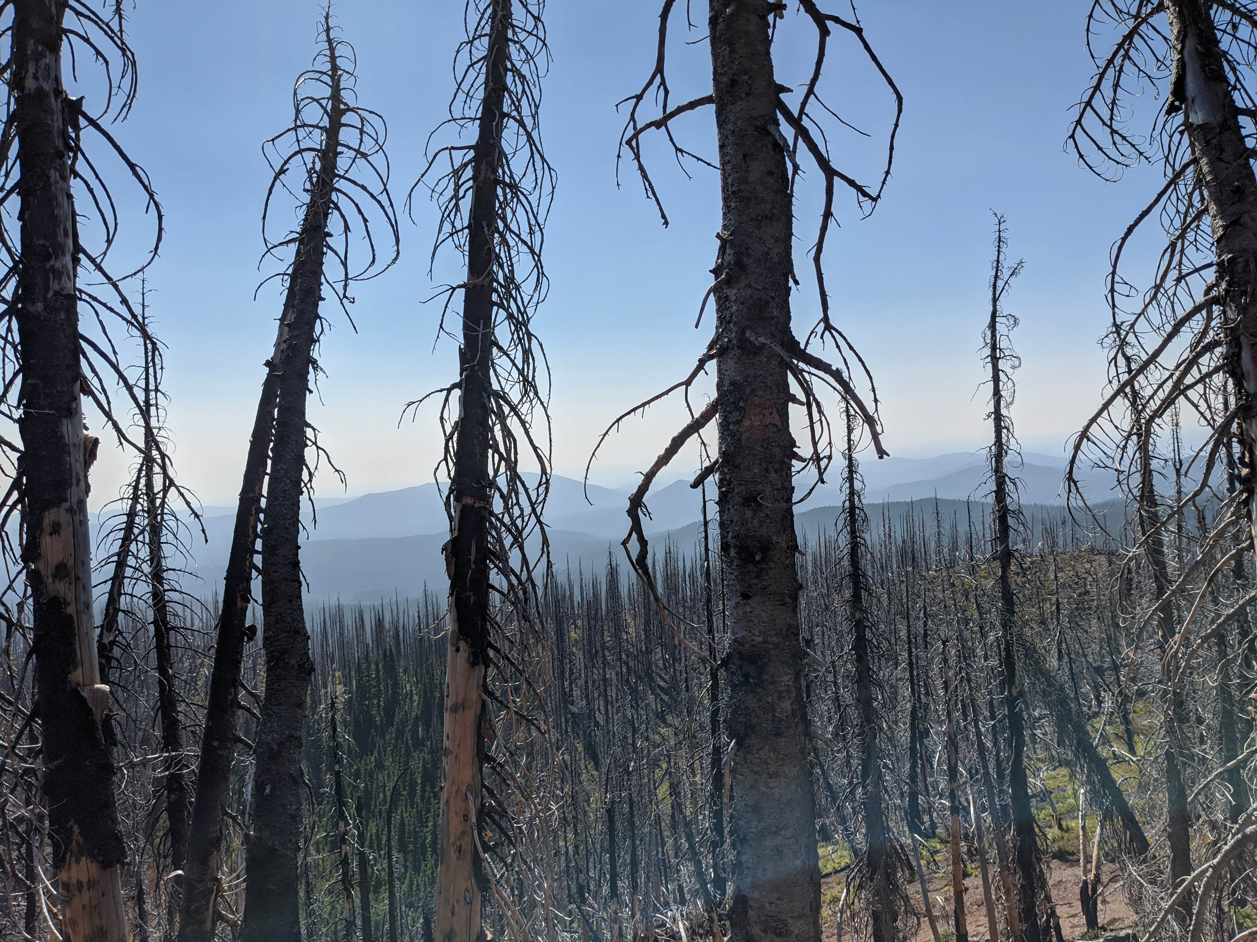 East Crater is a peak in the Indian Heaven wilderness. Three years ago, the south side and ridgeline of East Crater were completely burned by a fire that ended up burning about 500 acres in the area, and this fire caused the evacuation of the entire Indian Heaven wilderness area in September of 2017. Not much has grown back on the south side, while the north side, essentially untouched by the fire, is thick with trees. I did this activation in conjunction with Gifford Peak and Lemei Rock on a three-night backpacking trip, but this peak can easily be accessed from East Crater Trail with a trailhead a few miles to the east. We approached from the junction on the north side, where East Crater Trail meets the PCT, and headed west on the PCT for a few hundred feet. We left the trail at about 46.0029, -121.7893, and headed straight up (tending east). I don't have an exact track, but this route became thick with short trees about halfway up. It is still doable, but there are a few thick stands of young trees you need to push through. The entire ridge is in the AZ, between all the high points; the actual height variance is probably not much more than 40 feet, and this can be seen clearly if you head east along the ridge. The ridge rises to a bump at 45.9996, -121.7866 and then descends maybe 10-20' to another ridge that goes to the true summit - which is barely even taller than that bump. The west prominence is a reasonable activation spot, and the west side of the ridge has the best approach, as we found out on descent - we went from the western prominence of the ridge directly down to about 46.0016, -121.7938, and I recommend you follow the PCT around in a similar fashion before climbing. Right now, that approach is well-shaded but the ground is relatively clear of brush, and you will have a much easier (but still steep) hike up. The third approach you might consider is to come at it fully from the west, and this approach probably has the very best slope and lack of obstruction, but it ascends through the burnt forest and therefore does not protect you from the sun. I made 4 contacts on 2m FM, just managing the contacts with a broken Long Ranger. If you want a little more assurance of getting into Portland, take at least that much gain for VHF, and preferably a yagi; you have prominence, but also some obstructions in the way. You may also raise several hams in Stevenson and around.