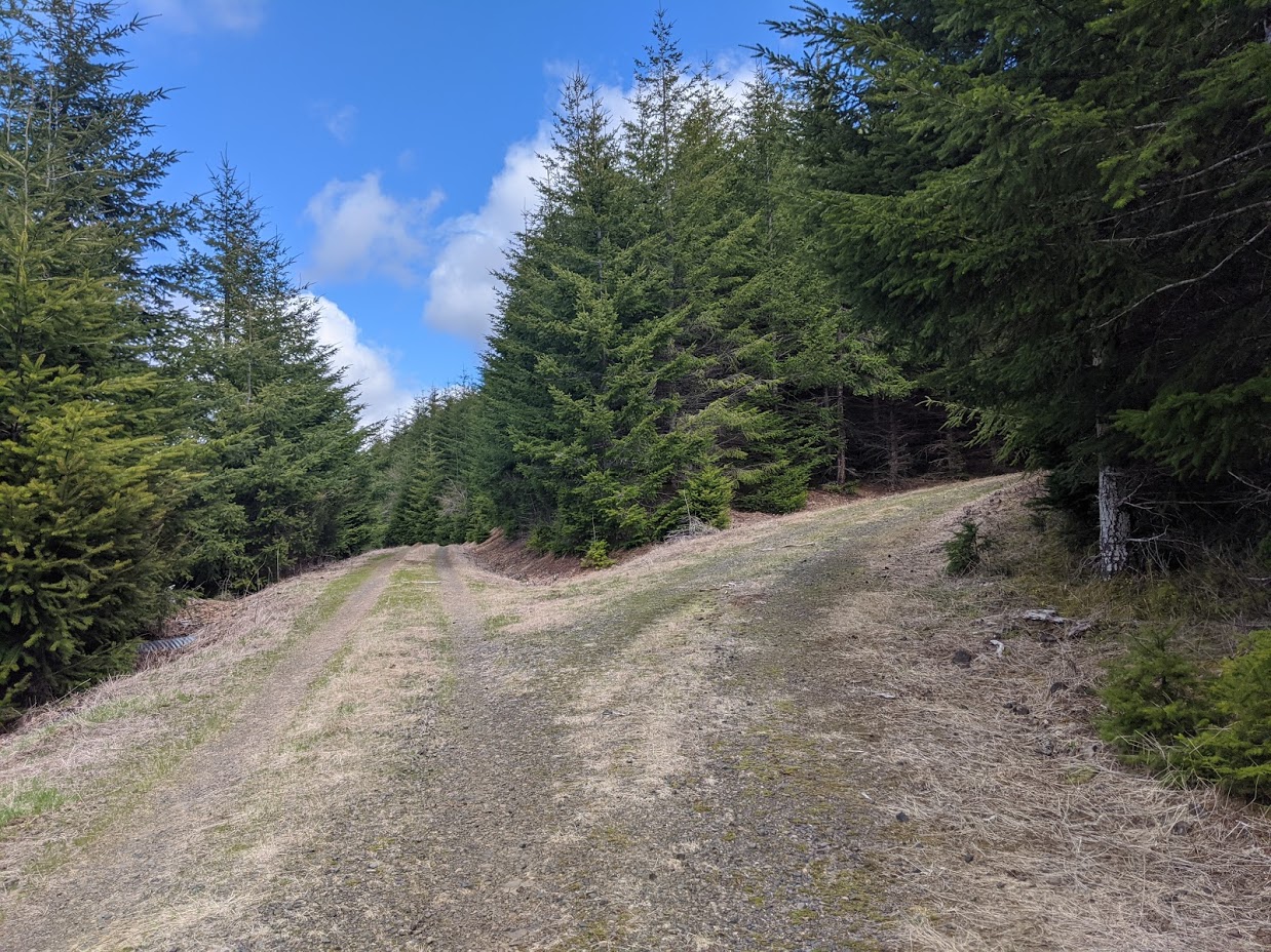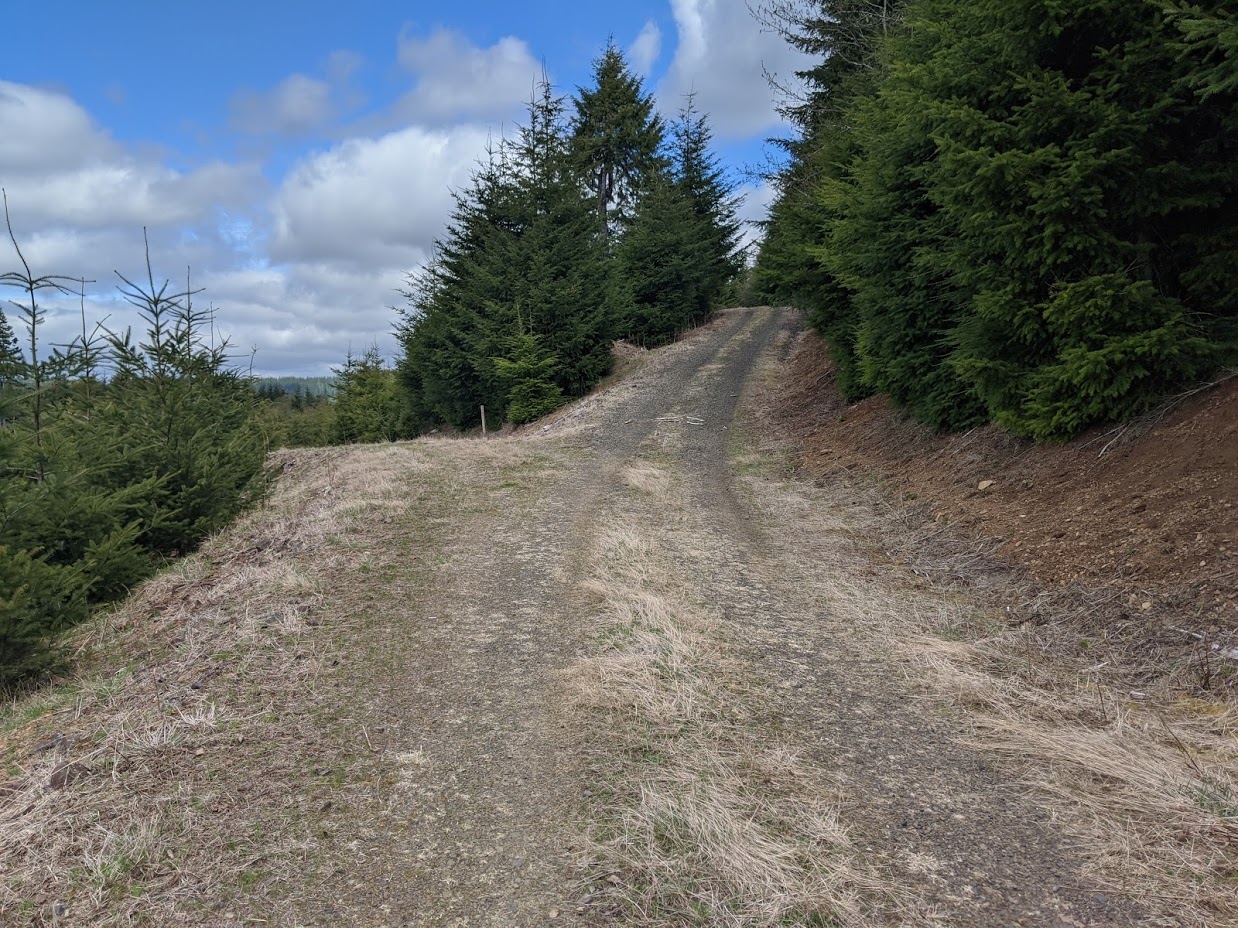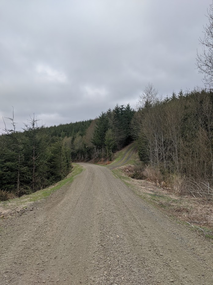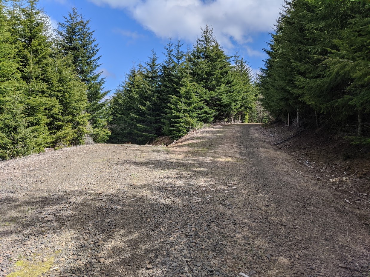 From here it is easy - walk across the bridge, turn right soon after, and then take the left branch of this road, marked on CalTopo as Green Mountain Road, most of the way up this mountain. You will see spurs to the left, and some spurs lead backwards to the right, but the first spur that climbs substantially up the mountain to the right will be at 45.8385, -123.4458, after two miles traveling along this main gravel road, and you should follow it. Up to this point the road is very shallow grade gravel, a major gravel road, and after this turn it is a well-maintained minor gravel road. You could drive up it in almost any vehicle, if you had permission; for our purposes, it is just a lovely hike.