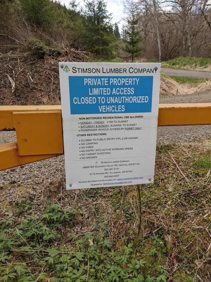 Drive to North Fork Wolf Creek Road on US 26, at 45.7806, -123.3454. This is a well-graded but occasionally steep gravel road. Continue on the main road to 45.7922, -123.3851, and take the left fork, which should appear like following on the obvious main road. At the fork at 45.8026, -123.3937, the road will split into two relatively evenly maintained roads, and you take the right fork, which ascends substantially. You follow this road past a number of much-less-inviting spurs, going left, left, left, and then passing a road departing at a right angle until you get to the turnoff at 45.8146, -123.3816, where you will turn down a nice enough but narrower dirt road. Follow this down to join another dirt road and continue heading west, until you reach a dead end at the Clatsop Forest/Stimson Lumber land boundary, at 45.8198, -123.4127. Here, your hike begins.