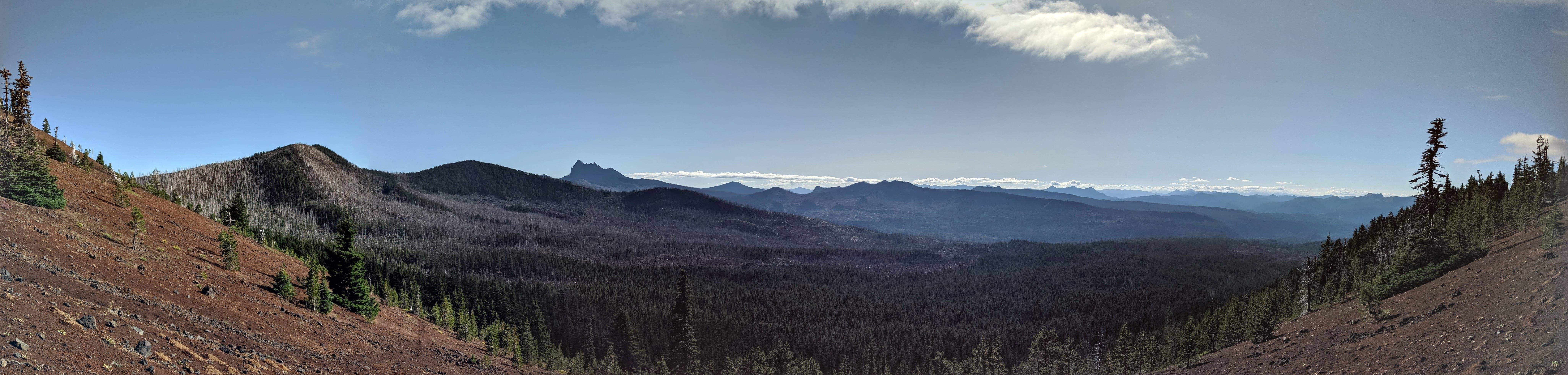 You will have unbelievable views, both climbing to the cinder cone and once you get there. This peak climbs away from the forest and gives you magnificent views of the burn that occurred, showing patches of complete burn and patches of complete forest survival. You will also have magnificent and close views of Three Fingered Jack, and once you crest the mountain, an absolutely breathtaking view of Mount Jefferson from a uniquely close position, as well as unobstructed views in all other directions. There are a few scrubby trees at the summit, but from various points you can see in every direction that Mount Jefferson doesn't obscure. Panorama of the view View from the ridge, most of the way up, facing south-east. Three-Fingered Jack features prominently. Mt. Jefferson over the ridge of South Cinder Peak. Jefferson came into sight, so suddenly and strikingly that I yelped. We had plenty of contacts on 2m, getting K7ATN on low hills in the Coast range and working stations on several mountains in Washington, as well as plenty of contacts from Bend, Redmond, and Prineville. I was using a 3-element yagi, but we were able to work some stations with a whip. I didn't even bother getting HF out on this summit. You may not have as many stations on other summits, but we also didn't stick around very long; any other summits in the area should hear you easily.