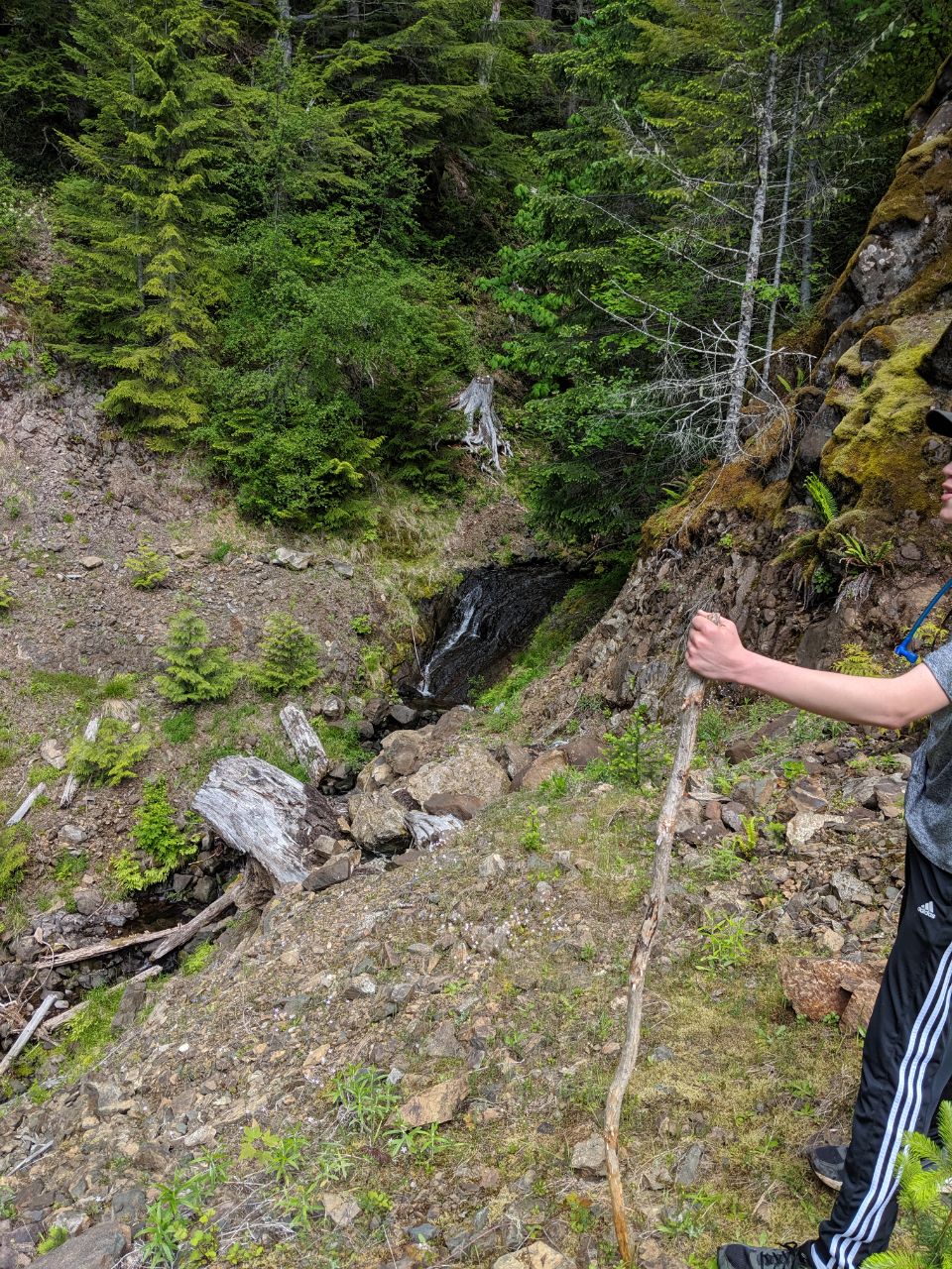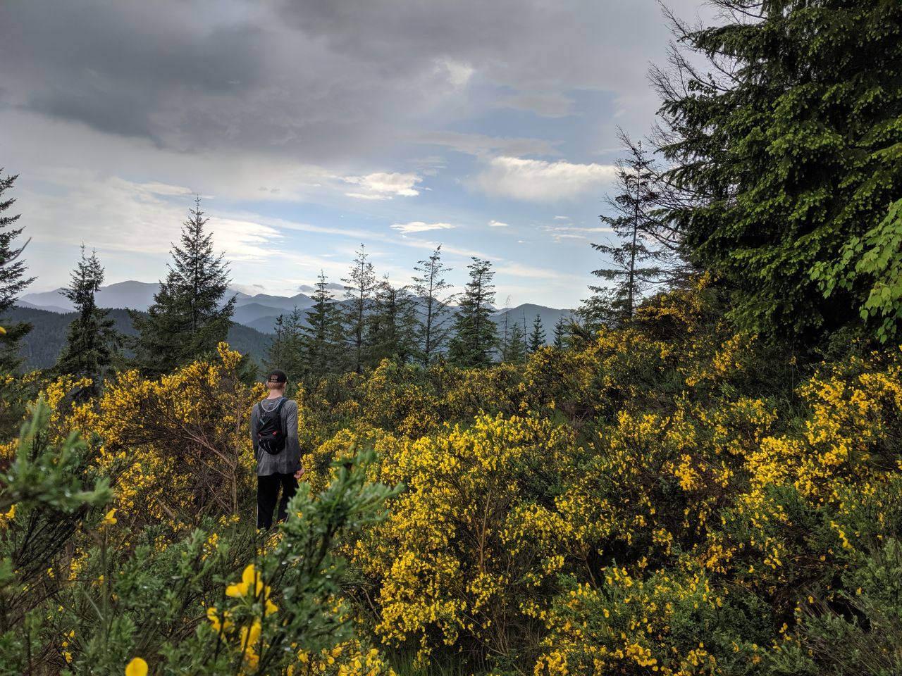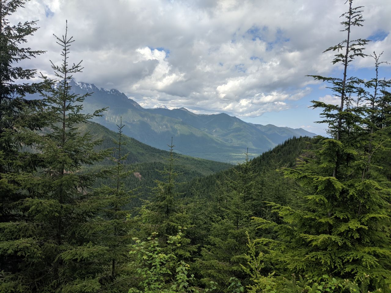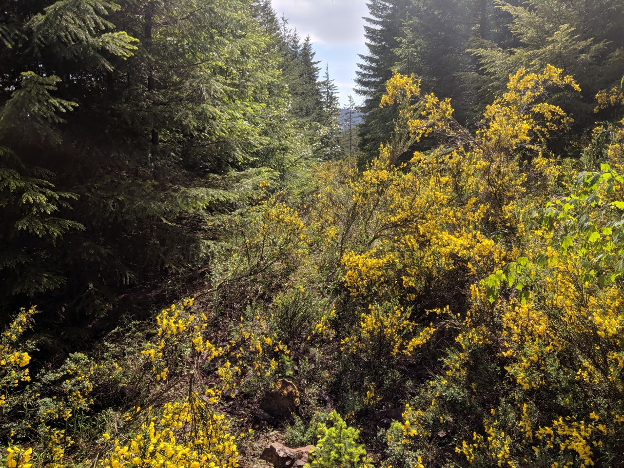 After studying the map, I thought it was worth checking if the road that approaches the summit is accessible. I invited my family, and we drove up to check, and it definitely is not. We drove NF 23 to NF 2353, which proceeds past some campsites to the trailhead. There is a gate that is sometimes closed, but this doesn't really add a lot of effort to the trail. We got to NF2348, which turns into NF2365 and heads up the mountain, to find a berm had been constructed, decidedly closing the road. We made the decision to hike it anyway, and embarked. We had a late start to the day, embarking around 11:00, so we didn't make it The first thing we noticed is that the road is completely washed out at the first creek, but the three hikes are passable - just be prepared to scramble up washed-out embankments. Nothing here has dangerous drops, just steep slopes of soil you have to pick your way across. After proceeding in two miles, you'll encounter thicker and thicker scotch broom, eventually finding parts where you must more-or-less wade through it. Sometimes patches will open up, but the best route is often on the high side of the road. Proceeding up further and around the ridge, it starts to clear out, and then turns to birch, which begins to dominate the growth that has overgrown the road. At the easternmost point of the road, where you start to proceed west again, there is a tee intersection and a large boulder, and some lovely mossy footing; this road seems to continue down that side of the mountain a ways, but we didn't explore it far. There is one other Y intersection just beyond this point, at about 3 1/4 miles past the NF2365 branch-off point, where the road crests the ridge, proceeds along it, and then turns down the north side of said ridge. The other branch of the Y proceeds on the south side of the ridge; my maps show the road on the north side, but not the one on the south side. The north road proceeds up the mountain. We went this way. This is where the birch starts in earnest. We found ourselves pushing our way through dense thickets of birch saplings. The track of the road is easily followed, but the overgrowth is slow going. We made it about four miles from the trailhead by 2:00, and we decided that it would likely take us another hour to summit, if not more, which would likely put us back down the mountain at 7:00, so we called it. We turned around and proceeded back down the hill. Despite the thickets of brush, it is actually pretty quick going through them when you're sped by going downhill, much faster than it is uphill. If you choose your path well, you will make it through with some speed, and having done it already, you will find it easier to pick your path. This trail is doable, but strenuous, unmaintained, and for the determined hiker only. You will not get lost but you will struggle to get through the trees. Wear long pants and long sleeves to protect your arms. Cell coverage is good once you have climbed a mile or so, varying depending on carrier, but AT&T and Project Fi both provided good coverage on most of the trail, cutting out only in spots. Consider hedge clippers or a machete, to make the trail a little easier for yourself and the next person. Start early and expect to go much slower than you would anticipate. Tell me what you find up past the later stand of birch trees, if I don't try for this one again! Good luck, and happy peakbagging!