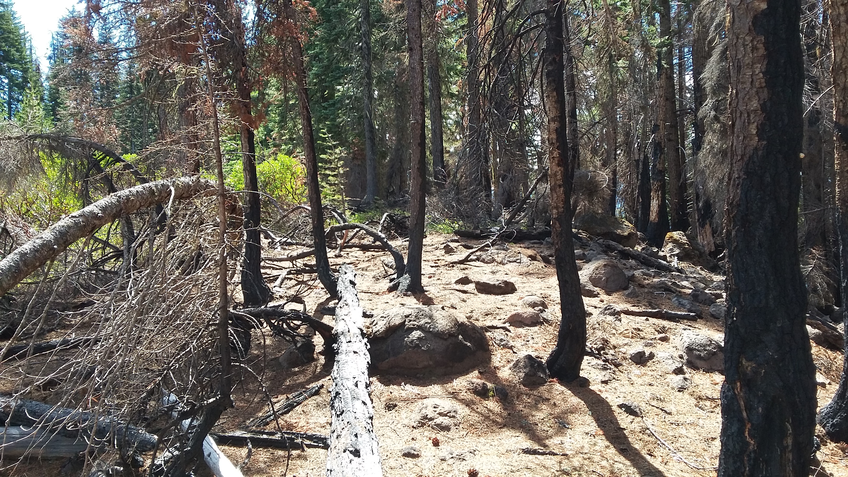 The summit proper is in trees - part of a burned area that you might not want to use for an activation if there's much wind. But there are open areas in the large Activation Zone in the manzanita or various rocks to perch on and enough live trees left to support antennas.