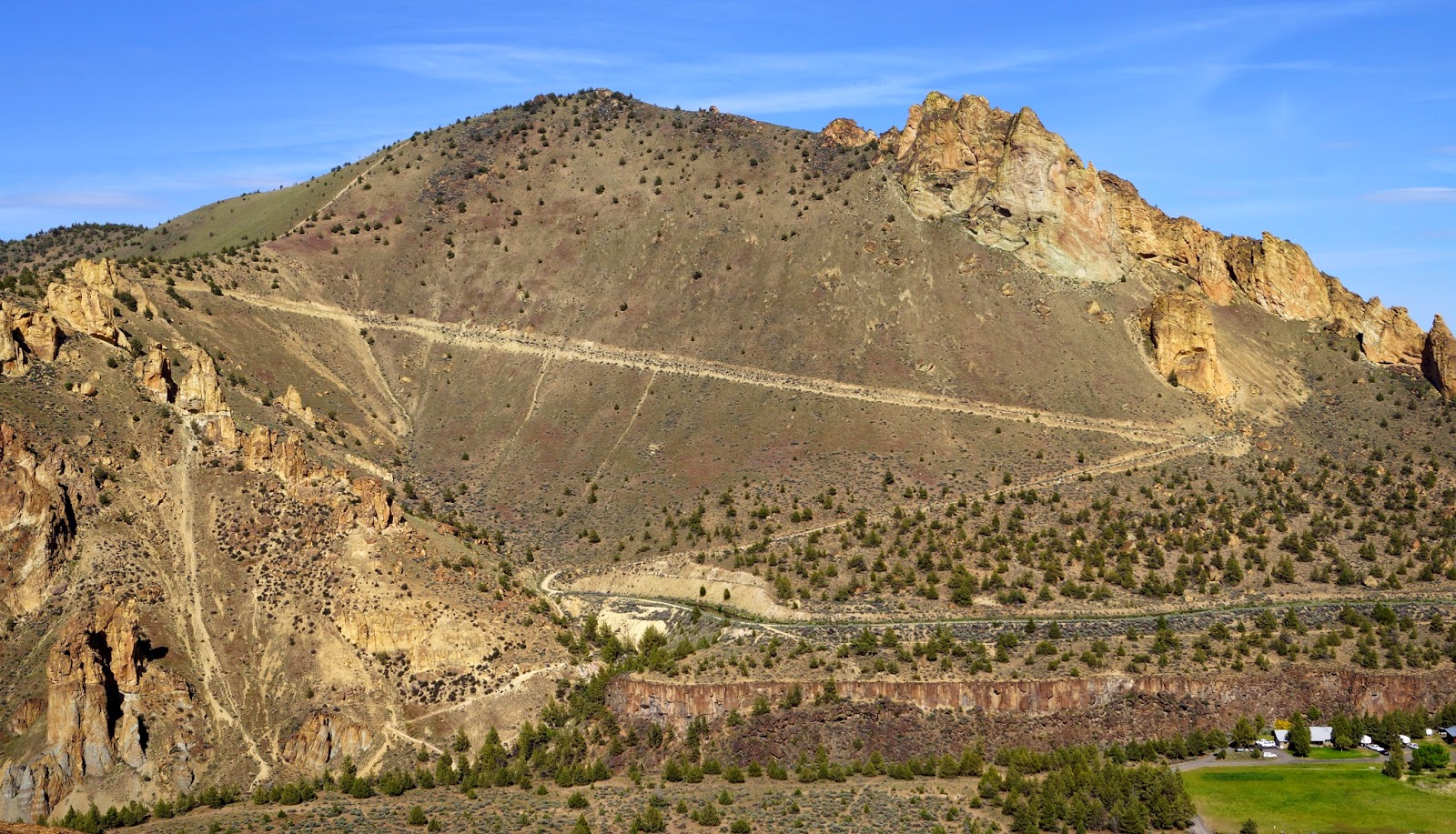 From the Park you’ll head down the Canyon Trail and across the bridge over the Crooked River (about 0.3 miles, depending on where you park your car). Head east on the Wolf Creek Trail along the river, heading north and then back south for 0.9 miles. You’ll head up a trail about 0.2 miles to intersect Burma Road where an irrigation canal exits the slope near 44.3727°, -121.129°. Burma Road makes a long switchback and after 0.9 miles you’ll go right up a steep trail heading towards the summit. Near the ridge top bear right to the summit proper where there are a few small trees and some spots to sit. Total elevation gain from the river is about 600 feet.
