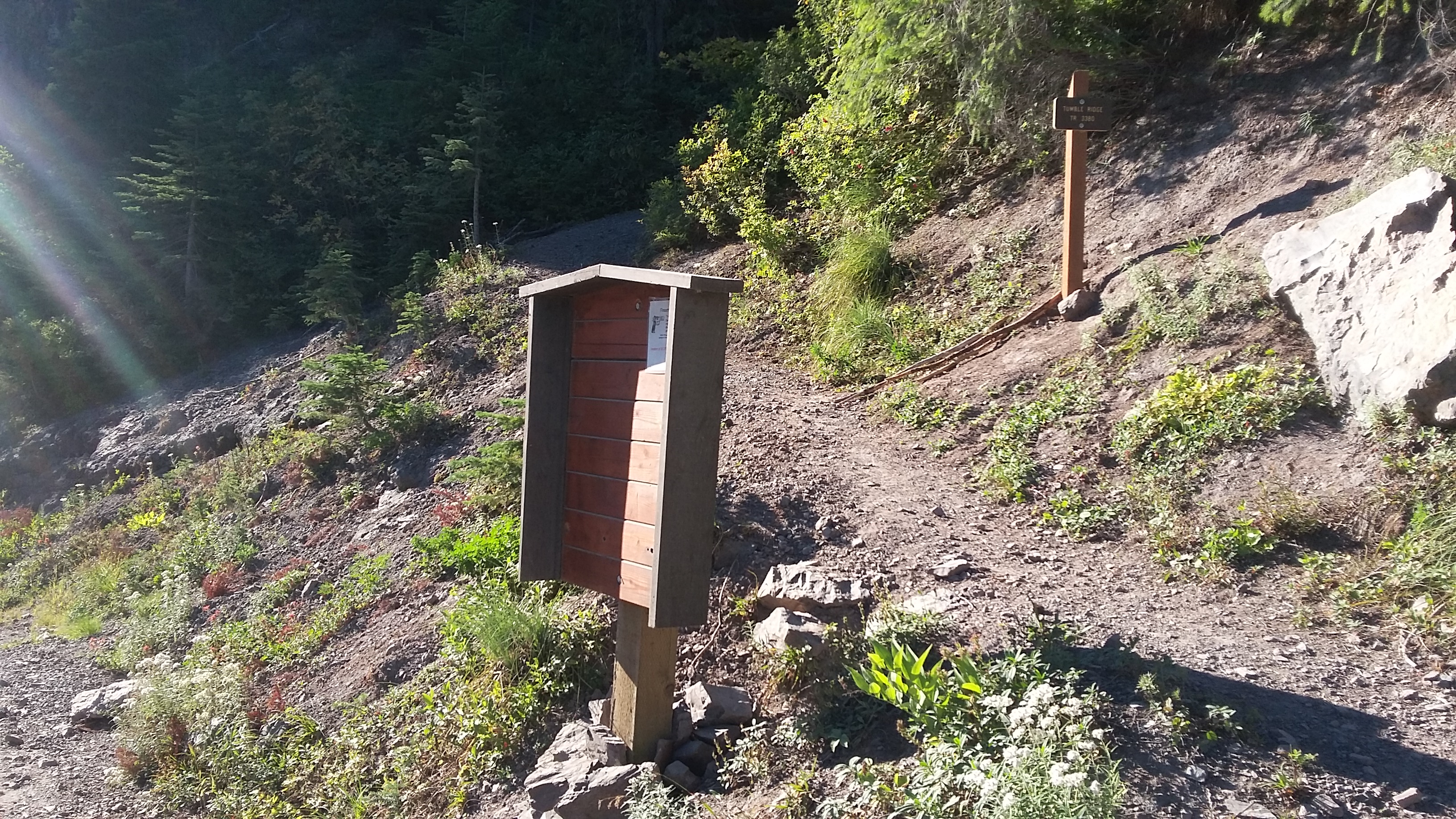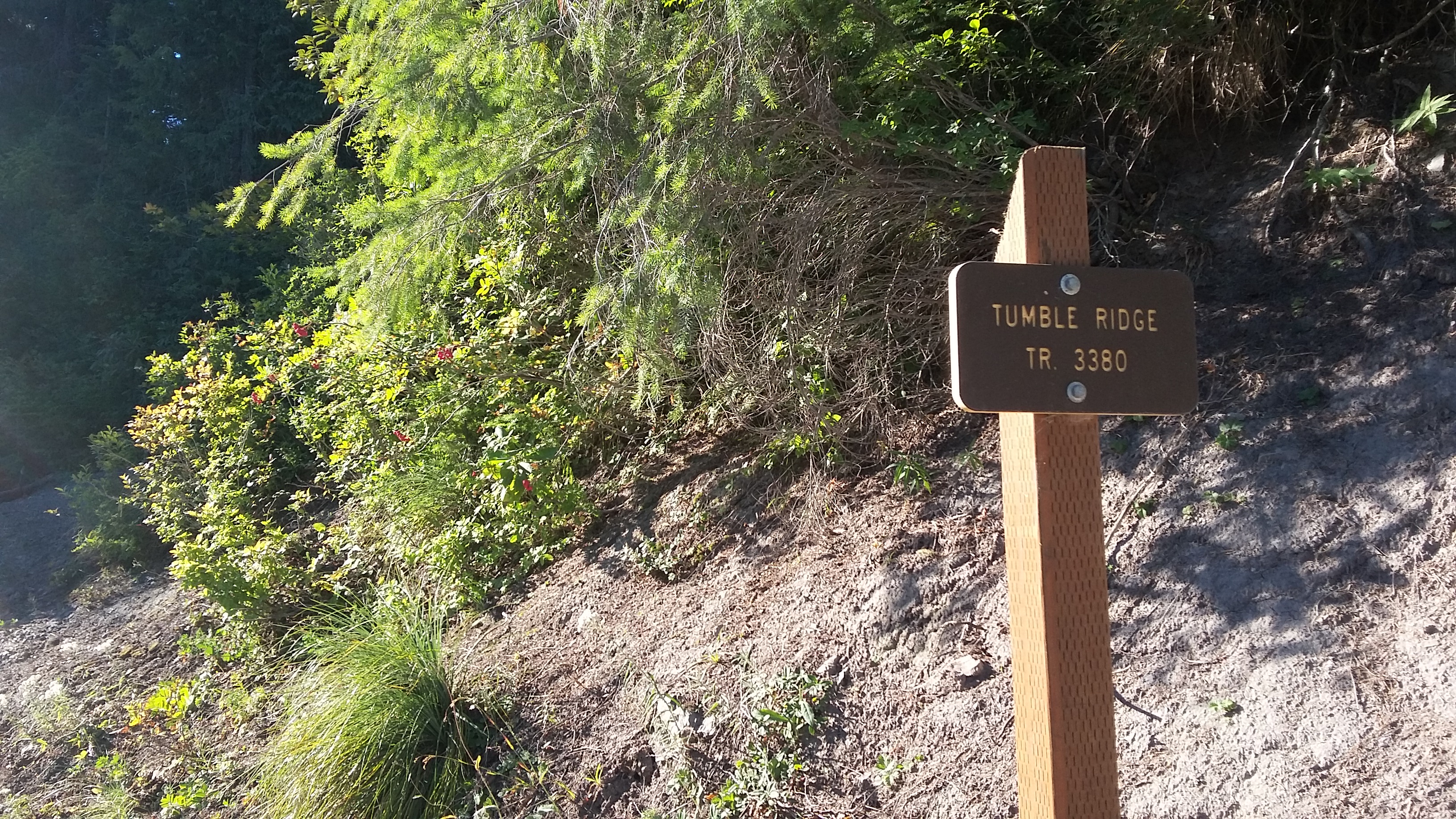 The Tumble Ridge Trail (3380) trailhead can be found near 44.755, -122.224. From the Willamette Valley, take Highway 22 east until just before the Breitenbush River bridge takes you into Detroit. You'll turn left here onto French Creek Road and go about 4.1 miles until the pavement ends and keep left onto Road 2223. You'll go along this nice gravel road for 3.7 miles to the trailhead where there is room on the shoulders for about four cars.
