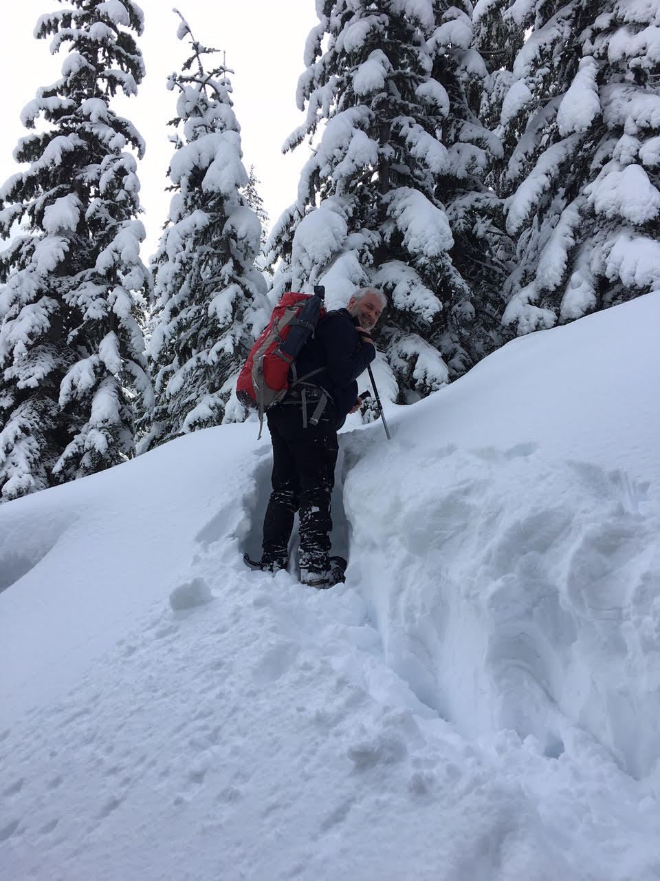A first activation of Eureka Peak on snowshoes turned out to be quite a workout. The basic climb description is about 2.5 miles one way and 1200 feet of gain, but the real work is off the trail with the last half mile being particularly steep. Since there is no trail to the top this would be difficult to do without snow cover. And the steep sections might be unsafe later in the spring on firm consolidated snow without crampons and ice axe.