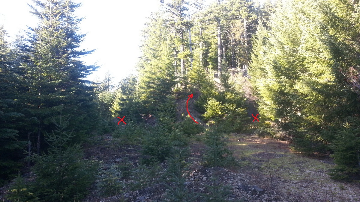From here it's a good climb with switchbacks on a mostly well-graded trail until you reach an old roadbed. Turn up the roadbed (right) and watch for where the road appears to split into two - take neither but look for the trail continuing on the ridge between the two roads (see the photo). The summit will eventually be reached and you'll find there foundations of the former lookout and good views to the west and south. Trees have grown up on the side facing Mt. Hood - good views of that peak can be found down the trail a bit.