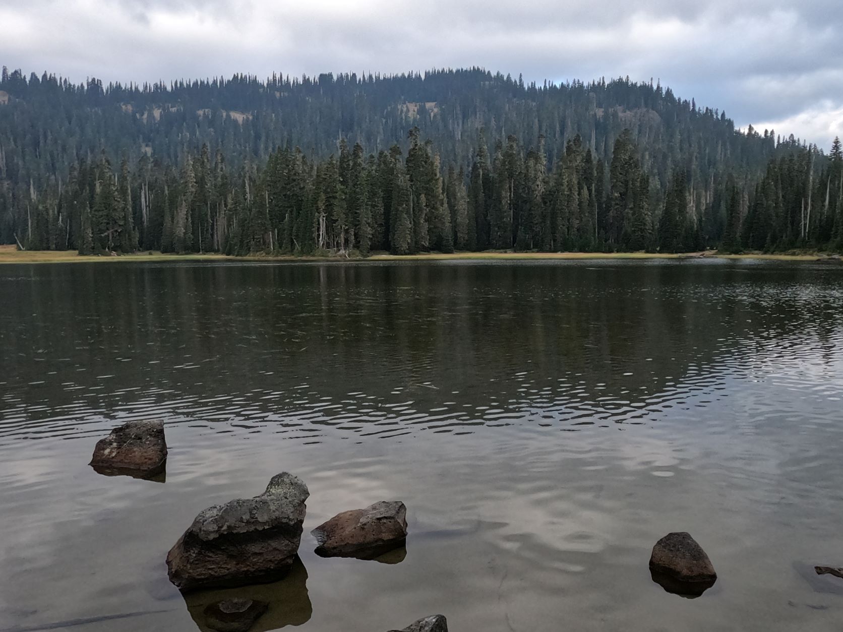 Start hiking from Soda Springs on Cowlitz Trail No. 44 after filling out a Wilderness permit. The trail starts easy for about 2.2 miles when you arrive at the rocky outlet from Jug Lake above. The creek was nearly dry this late in a low water year. A bit beyond the creek crossing, take the Jug Lake Trail No. 43. where you'll begin some serious climbing. In another 1.2 miles find Judkin Trail No. 47 for 0.3 mile to find Jug Lake. This would be a place to camp.