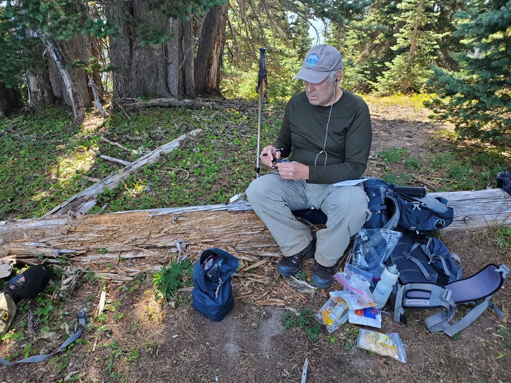 We continued about another two miles to camp on the far eastern shore of Fryingpan Lake with a view of Fryingpan Mountain. From here, find the Kincaid Lake Trail that heads north, rough and steep about 1.1 miles with nowhere near enough switchbacks. In a few places the tread was elusive. Where the trail tops out you can turn left and have an easy bushwack several hundred feet (not vertical) to the summit proper. There's a great operating position on a log, a spot that could accommodate a small tent, and some peek-a-boo views of the surrounding mountains. There was good T-Mobile, AT&T and Verizon coverage from the summit, but don't expect it anywhere else. An alternative might be to take the Kincaid Lake Trail #42 from just west of the Soda Springs Horse Camp and activate Carlton Ridge W7W/PL-027 and then approach Fryingpan Mountain from the north. A snip from the FS Topo map is included below - the blue "X" mark the locations of Carlton Ridge and Fryingpan Mountain - the full map can be found here:     https://data.fs.usda.gov/geodata/rastergateway/data3/46121/fstopo/White_Pass_463712122_FSTopo.pdf.