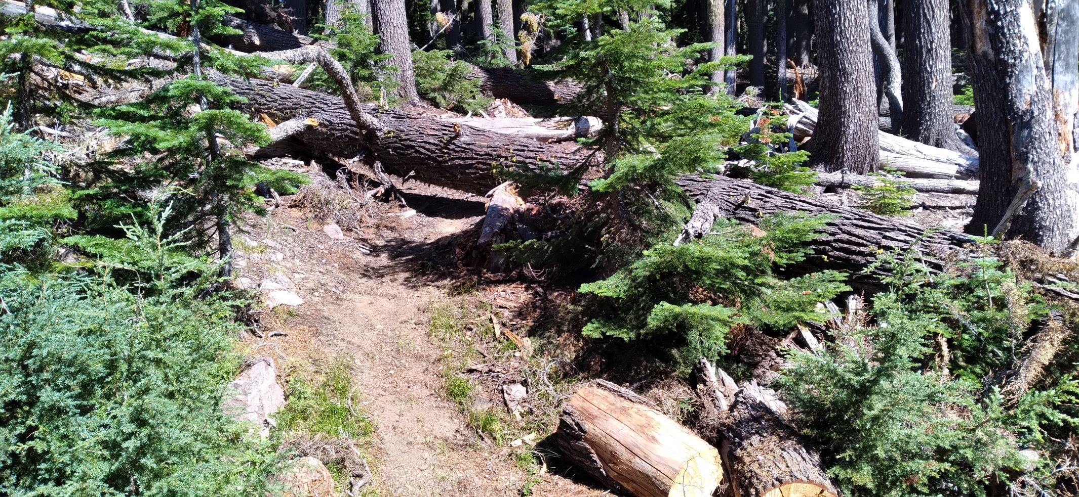 From Roseburg, Oregon turn on OR-138 East / Northeast Diamond Lake Boulevard. Continue on Highway 138 to milepost 83 to turn right (west) on Highway 230. Traveling 3 miles on Highway 230, turn north onto Road 3703, the Three Lakes Road, about 2 miles west of Diamond Lake. Go about 6 miles to Forest Service Road #3703-370 (This is not Dog Prairie Rd.). This is the place to park the Prius (43.1318, -122.2764) or continue in a high clearance vehicle about 1.3 miles to the trailhead. There's no place to park at this upper trailhead and the trail is not signed or particularly visible - there are half a dozen large trees across the trail in the first hundred meters or so.