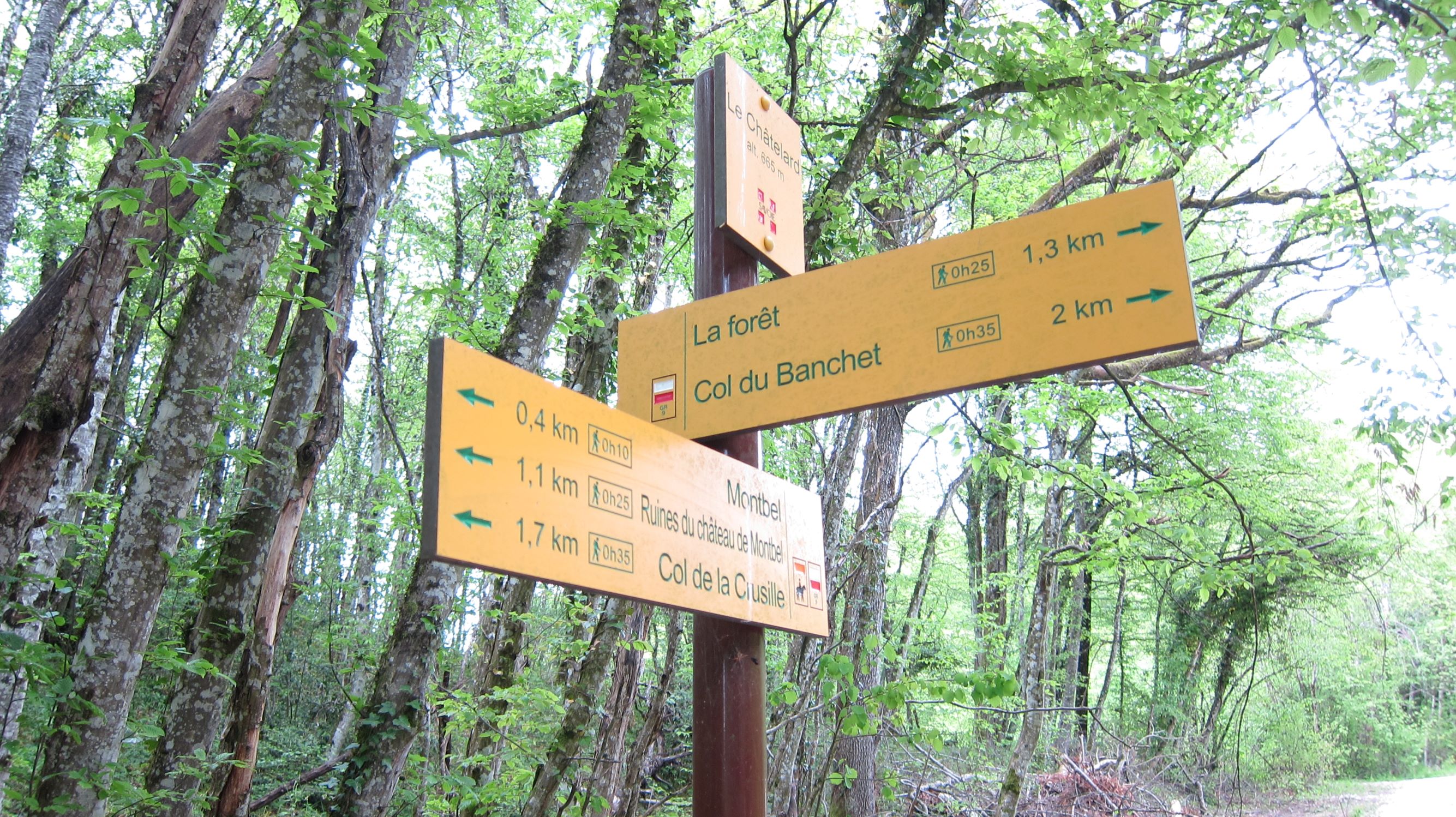 La Forêt is a forested one-point summit near La Motte-Servolex, France. Heading east on A43, just before the tunnel, exit at Lac d'Aiguebelette, pass through the toll plaza, take the first exit from the roundabout and then the next right. After you pass under the A43 and after about 400m, take a sharp left onto Route du Terreau and wind up the hills towards Ayn on D36E. Pass through Ayn and continue on D37 to Route du Montigon. A GPS will be quite useful in getting to the trailhead.