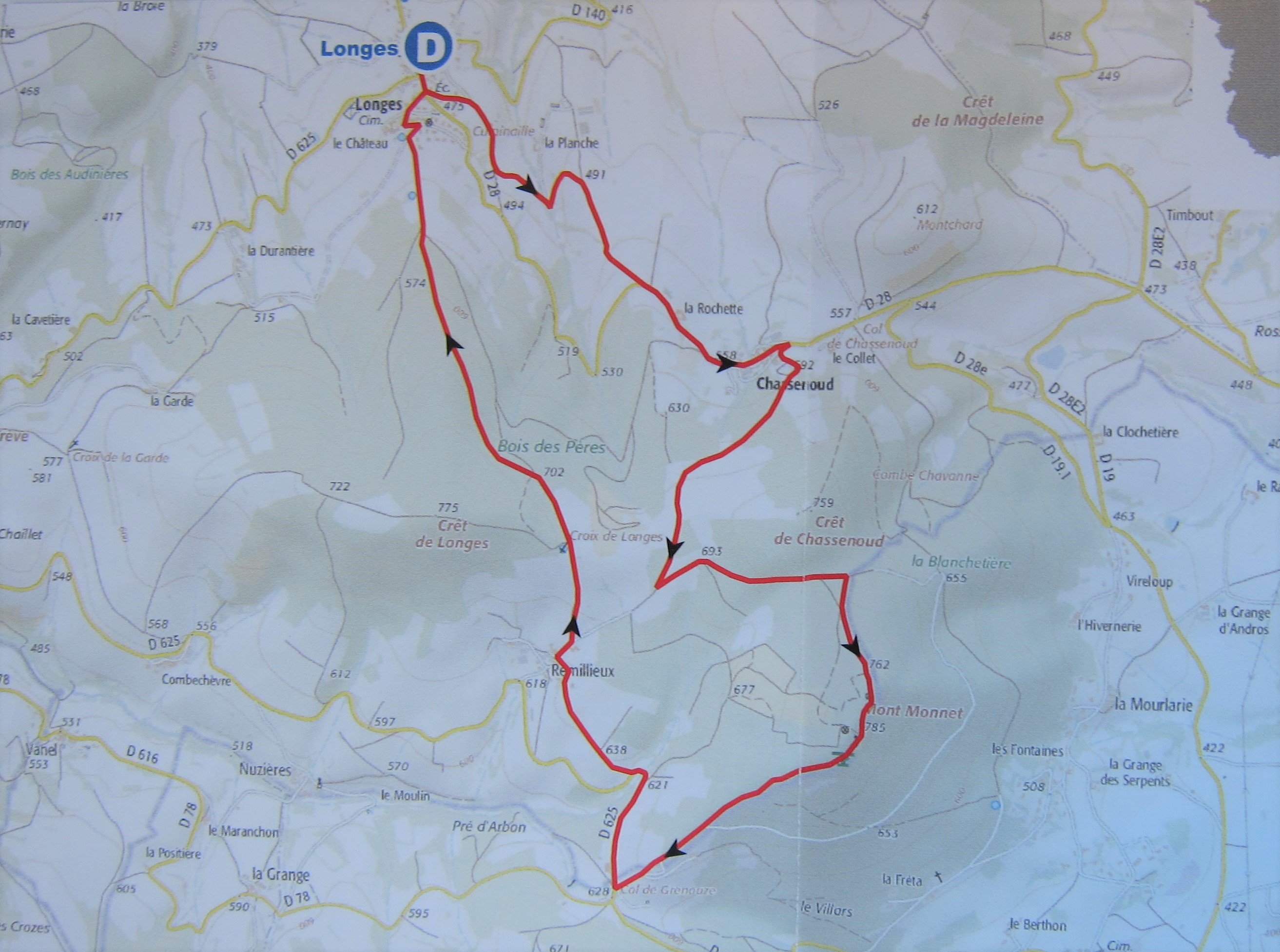 The easiest access to Mont Monnet is a 1.5km road and trail hike with a vertical gain of about 160 meters. Mont Monnet is in the Parc Naturel du Pilat near Longes, France. The map below shows the available trails - the shortest approach of 1.5km is from Col de Grenouze where there is parking (45.4768° 4.6971°).