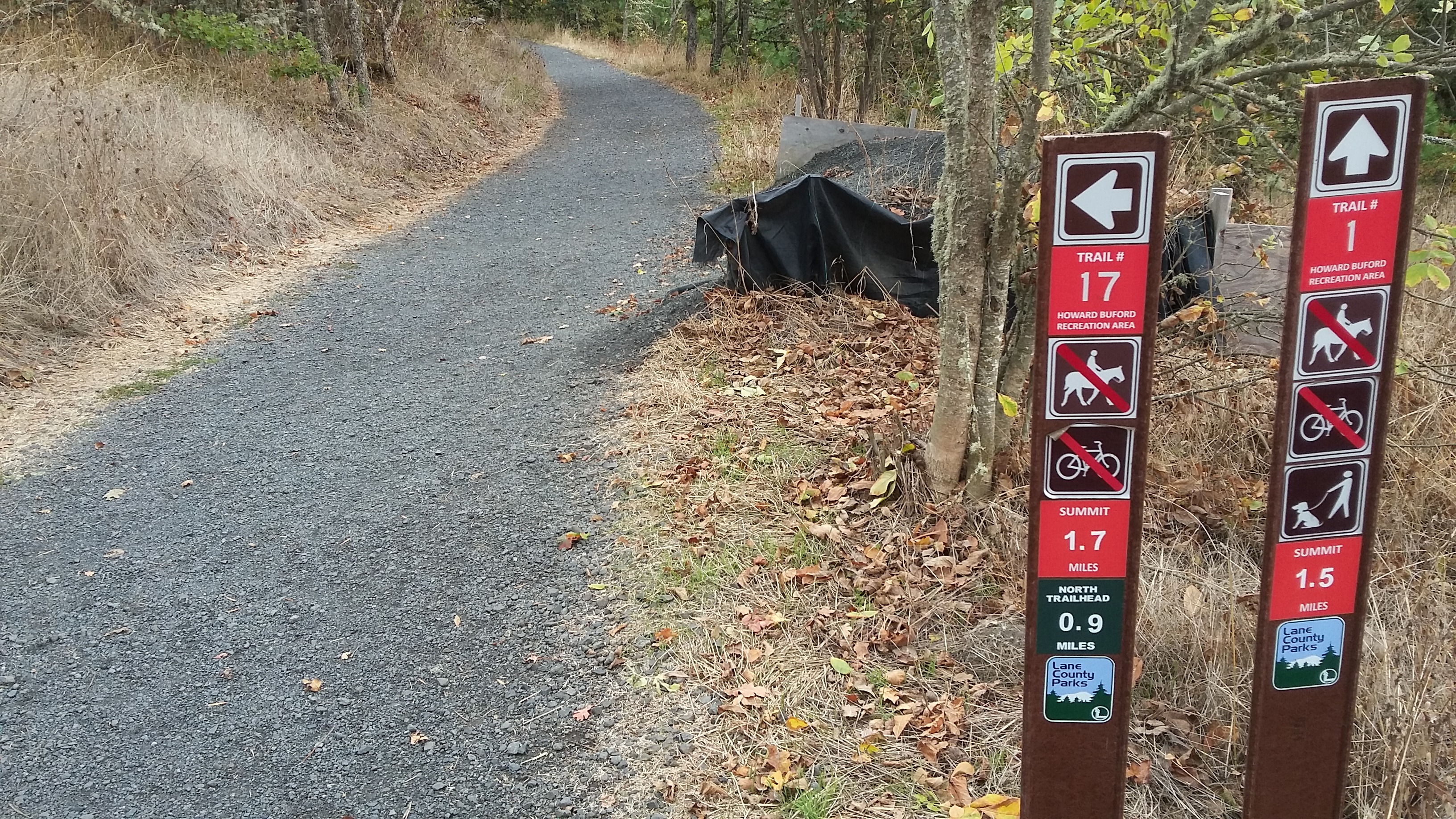 Note that a Lane County Park Pass or a $4 permit is required at the parking lot. You can exit I-5 at E. 30th Avenue and then use the east side frontage road to go north to Franklin Blvd. This will take you to Seavey Loop Rd that heads east toward the park. You'll cross a bridge and then head south into the slightly confusing parking area. The trailhead is near the pay station at a large gate. From the trailhead you'll keep on up the main track - it appears to be Trail 1 - to the summit. There are trail markers along the way - look for the word "Summit" to indicate the direction to go at any junction - but the path to take is the wide, well-graveled, and sometimes steep one. The last half mile is in a little worse condition, but it is just as wide. At the summit there is a concrete trig point at the and a bench facing east. To the south there are trees that could be used for antennas - but since this is a formal arboretum I suggest that you would avoid any activity that could damage the trees.