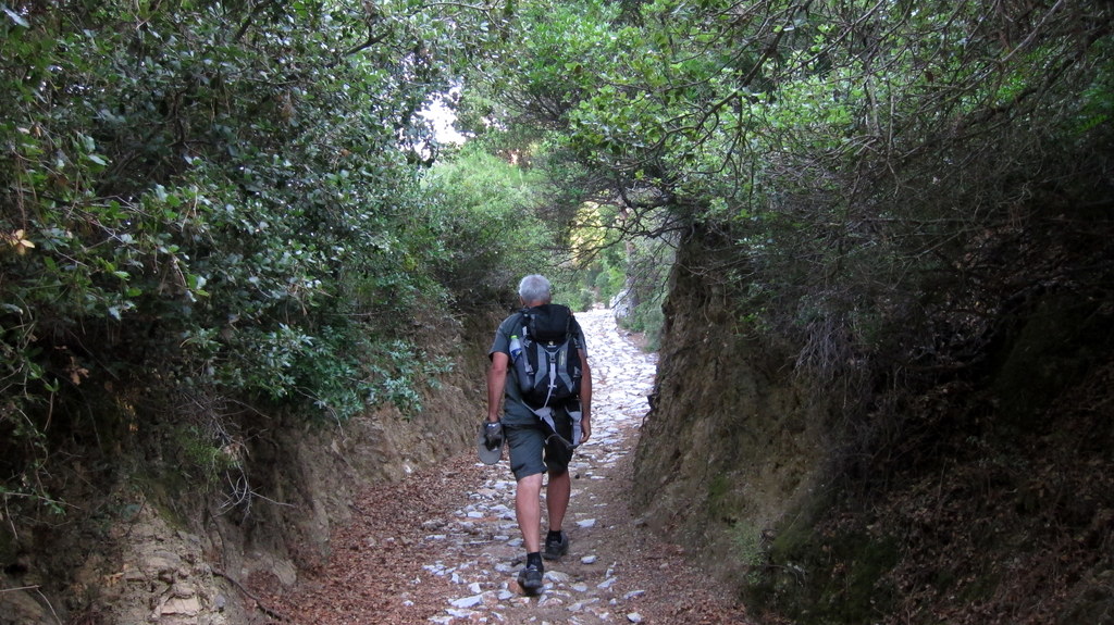 The T1 trail can also be started in several places along the road that heads to Moni Sotiros and towards the summit - in fact, about 0.7km of T1 follows the road. Note that the sign for "Palouki" at the left branch of the Y goes to Moni Evggelismou Tis Theotokou - you want the right branch at the Y to Moni Sotiros. The easiest for driving and still do some hiking would be to start the T1 from a sharp switchback near 39.120475, 23.748972 (trail length 3.1km, gain 430m). The next might be at a road junction with a shelter near 39.122608, 23.755984 (trail length 1.8km, gain 220m). And the last could be near a large cistern at the location 39.116985, 23.764550. From this last location the summit is about 0.8km and gain 170m.
