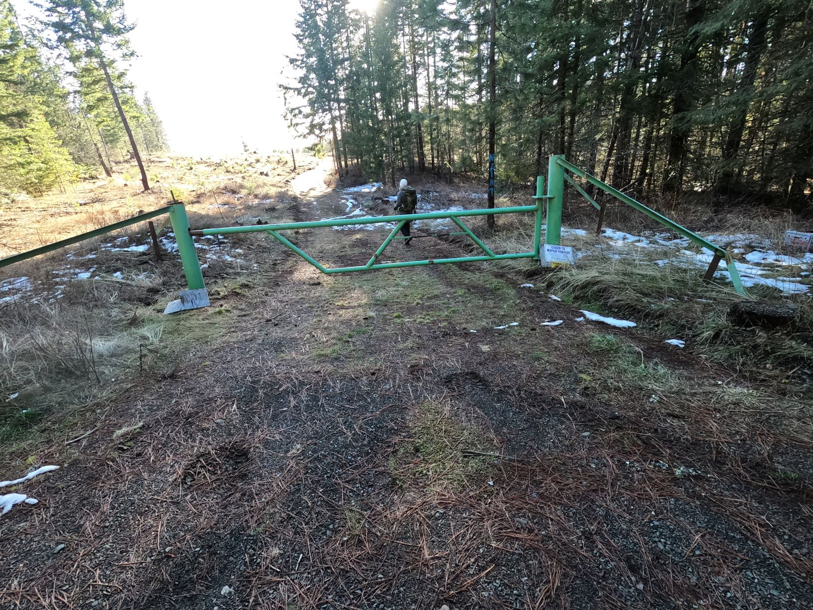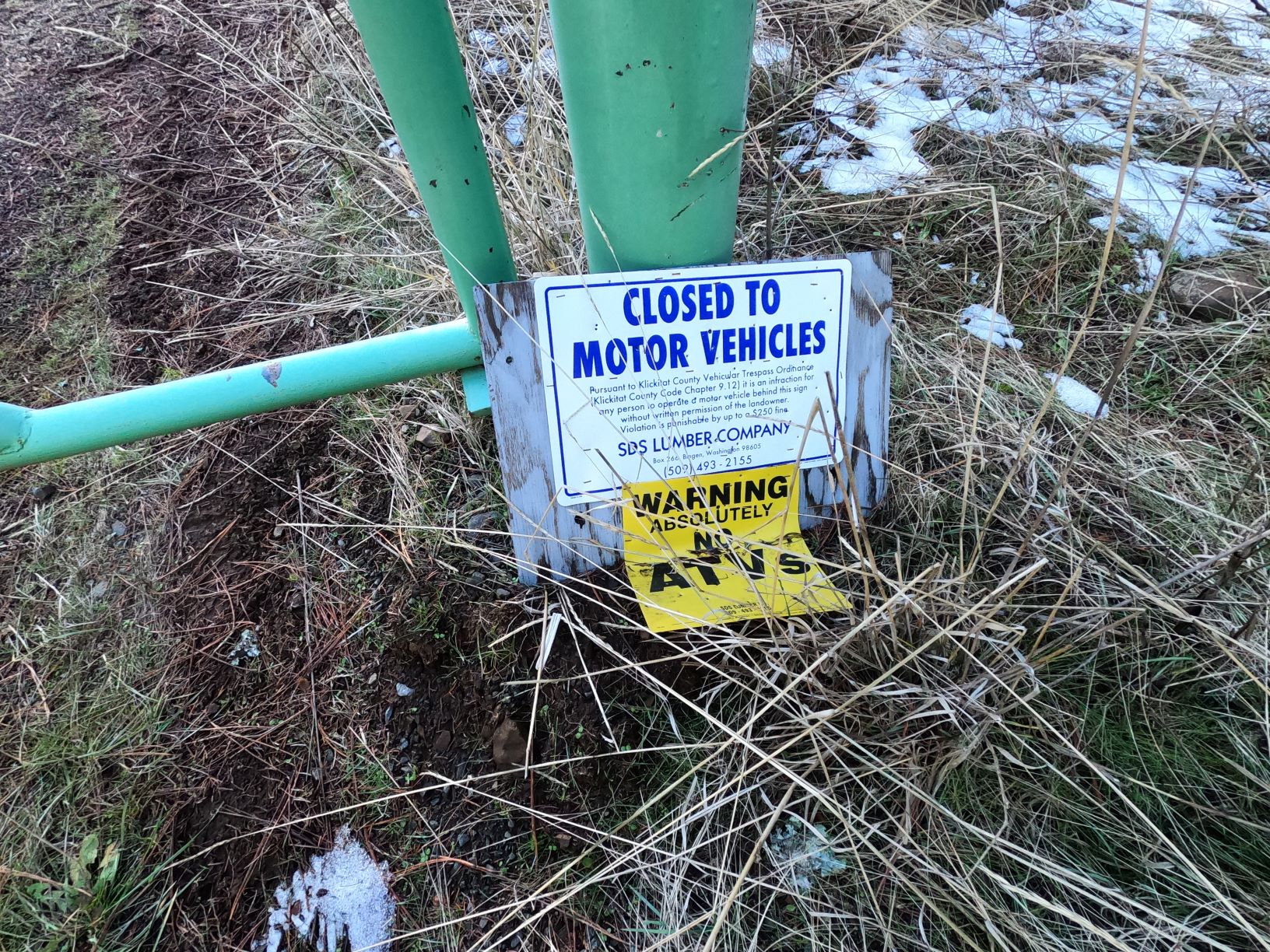 From the west side of Lyle, Washington on Highway 14 turn north just west of the bridge onto Old Highway 8 and go for about 1.2 miles to turn right onto Canyon Road. You'll continue on this road about 9.5 miles (mostly northbound) to turn left towards Appleton (westbound). Continue onto Sleepy Hollow Rd for about 2 miles to the gate near 45.8145, -121.309 pictured below (don't block the gate). Thankfully SDS Lumber Company is reasonable about access to their properties. The mud of winter was a feature of the road heading towards the summit. A GPS will be useful here - to find the gate and also to lead you in the general direction of the summit. We walked the road about 0.7 miles until the slope to our right was fairly open forest and not a brushy bushwack, and found a clearing within the Activation Zone less than 0.2 miles from the summit proper - which appeared to be in heavy forest. There were no views from our operating location. .No cell service was available for T-Mobile or Verizon. Spots were via Sprint Coverage. No 2m FM contacts were made.