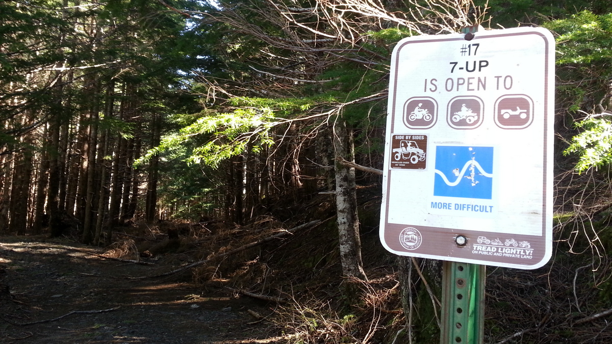 The NE trailhead is marked with a sign for "#17 - 7-UP" (see photo below). From here, it's a steepish 1/10 of a mile up an OHV track to a small clearing on the summit. The OHV trail from the west to the summit is much less steep, but longer at about 0.3 mile. NOTE that this is an active OHV area - set up OUT OF THE WAY of the trails and don't put any antennas across open areas. There isn't a lot of room to do this, but be safe and accomodating to the other users.