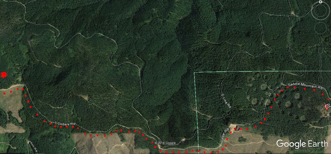 Go 1.3 miles to a major intersection where you'll continue west on 7 Cedars Road - this should be the second road on the left of the five roads meeting here. From here, continue west 1.0 miles to an intersection with an unnamed road heading right and uphill. My GPS called the road to the left 7 Cedars Road, but Google Earth has that name on the road to the right. From here you'll proceed around Peak 3534 for about 1.1 miles. There are three OHV tracks leading up to the summit of Peak 3534 - I choose the shortest one from the north from a trailhead near 45.55124 -123.43517. However, I now recommend the trail on the west side - it's much more pleasant. The map below shows the way from South Saddle to the 'red dot' of Peak 3534.