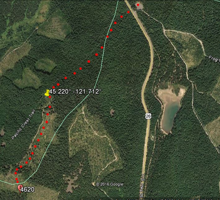Park at the Frog Lake SnoPark, about 12 miles east of Government Camp on Highway 26 (in winter, an Oregon SnoPark Pass is required). Cross Highway 26 to the trailhead for Pacific Crest National Scenic Trail (PCT) - it's quite obscure in the winter but it starts near the highway sign for Frog Lake. Here's a spot where a GPS will be very useful. The Blue Box Trail proceeds more or less directly towards the summit. The AZ is roughly 300 meters in diameter - once we passed into the clearcut area we set up and operated. We found no T-Mobile cell service and surprisingly, no APRS coverage, so self-spotting was a problem.