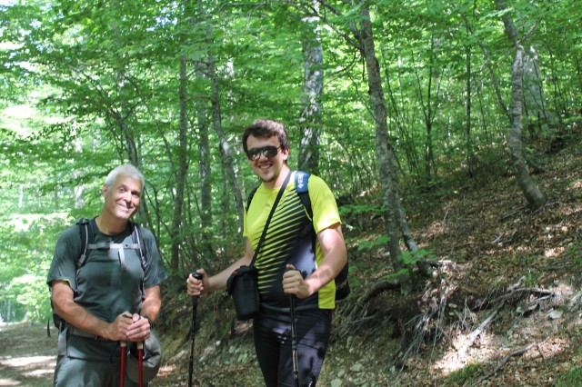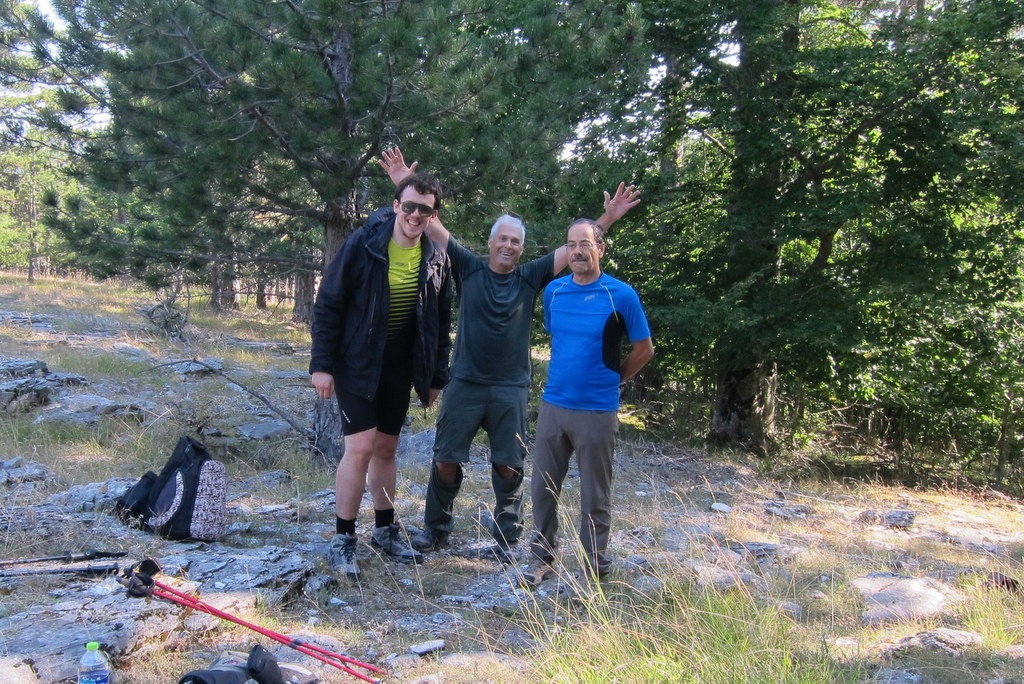 I was fortunate to have my local hosts, Christos-SV2OXS and George-SV2QLO to lead the way. To start from the trailhead, go up the road a few meters to an abandoned road switchback where you can most easily begin the trail. There are a few trail signs but mostly red markers on trees, red dots painted on rocks, and red arrows showing the directions to head. With good attention, you'll find your way up the trail, most of the way on abandoned forest roads. The last 0.9km of trail is along the summit ridge with views of the Olympos summits.