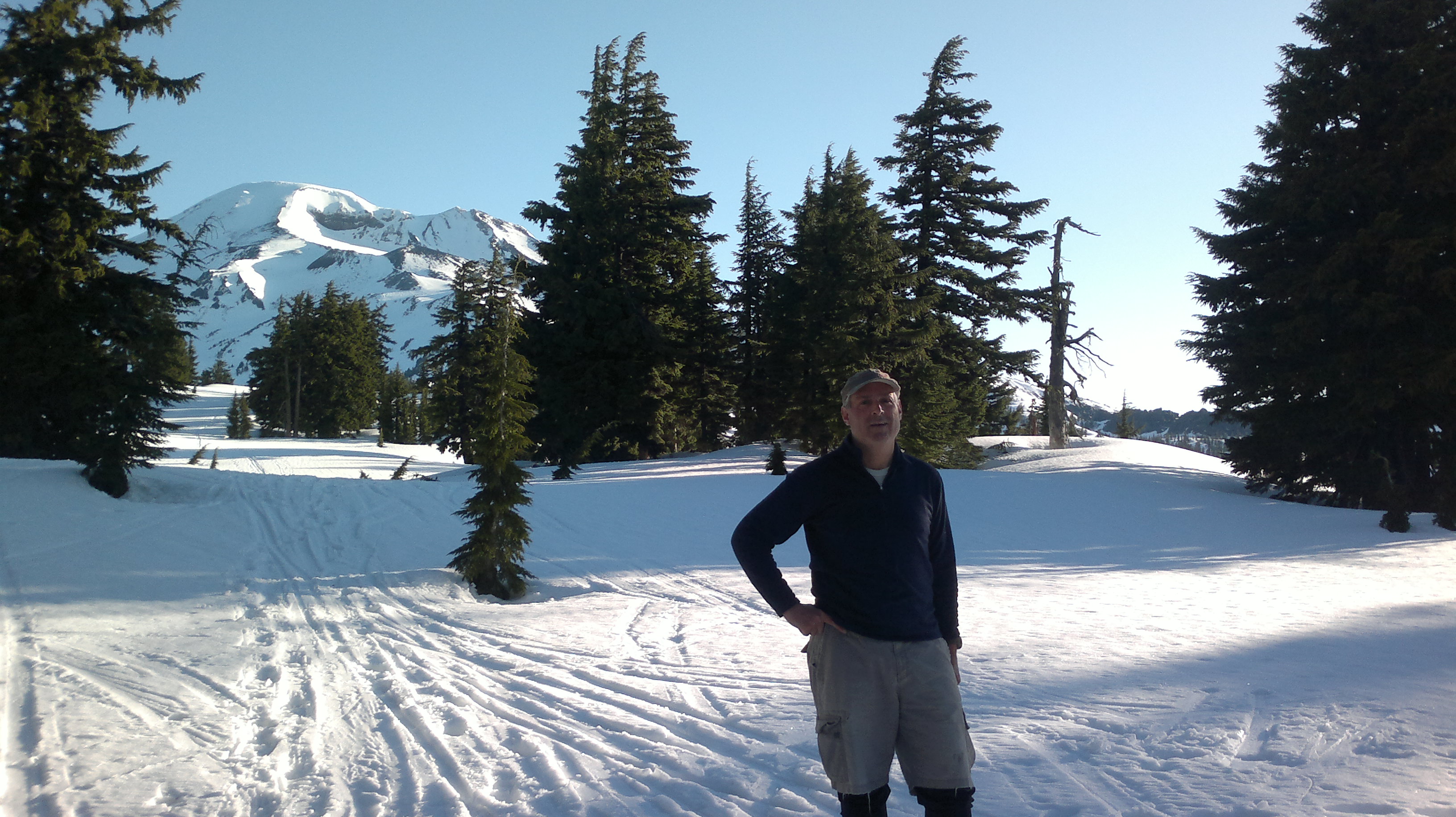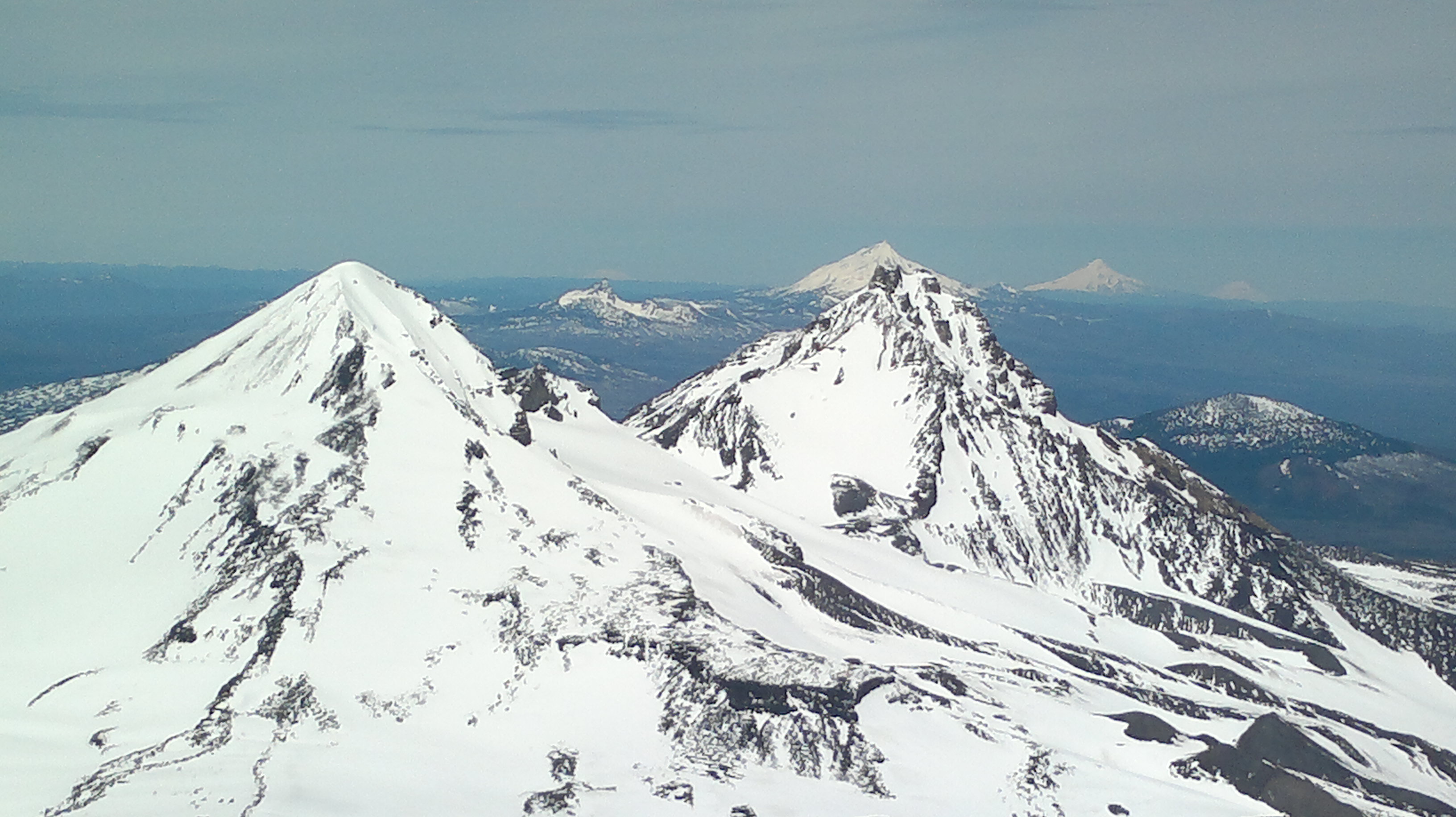 We started on skis right away, following a highly variable set of bootprints in the snow up Hell's Creek drainage. On coming out on the plain between this drainage and the mountain we were greeted with sunshine, blue sky, and a great view of the mountain. For the most part we skinned up (a napped fabric on the ski base allowing climbing) until about 9,200 feet when things get steeper and we started kicking steps and carrying skis. As I had occasional coverage from T-Mobile (signals from Mount Bachelor) I periodically was able to update my alert with current elevation and timestamps in a poor-man's version of APRS.