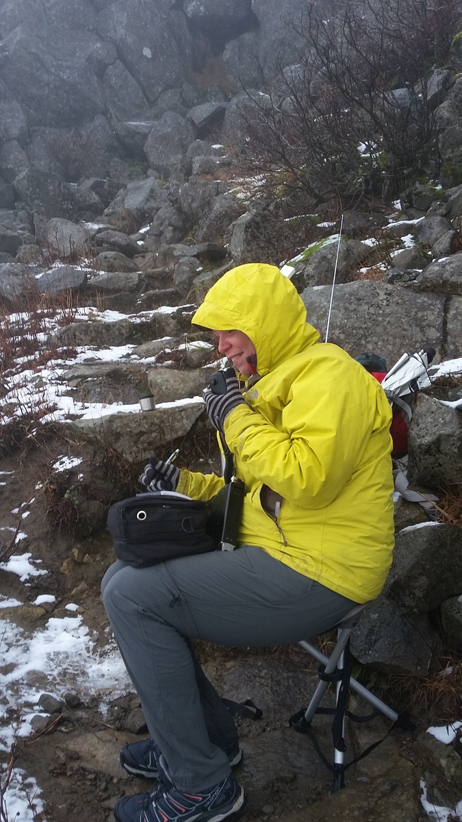The photo below was found online - we were not lucky for weather or visibility. There is a fun operating position from the very top for VHF/UHF, but it may be easier to set up antennas and operate from lower down on HF. There are a few old fenceposts that can secure a pole for an antenna, but as you can see, no trees on this summit.