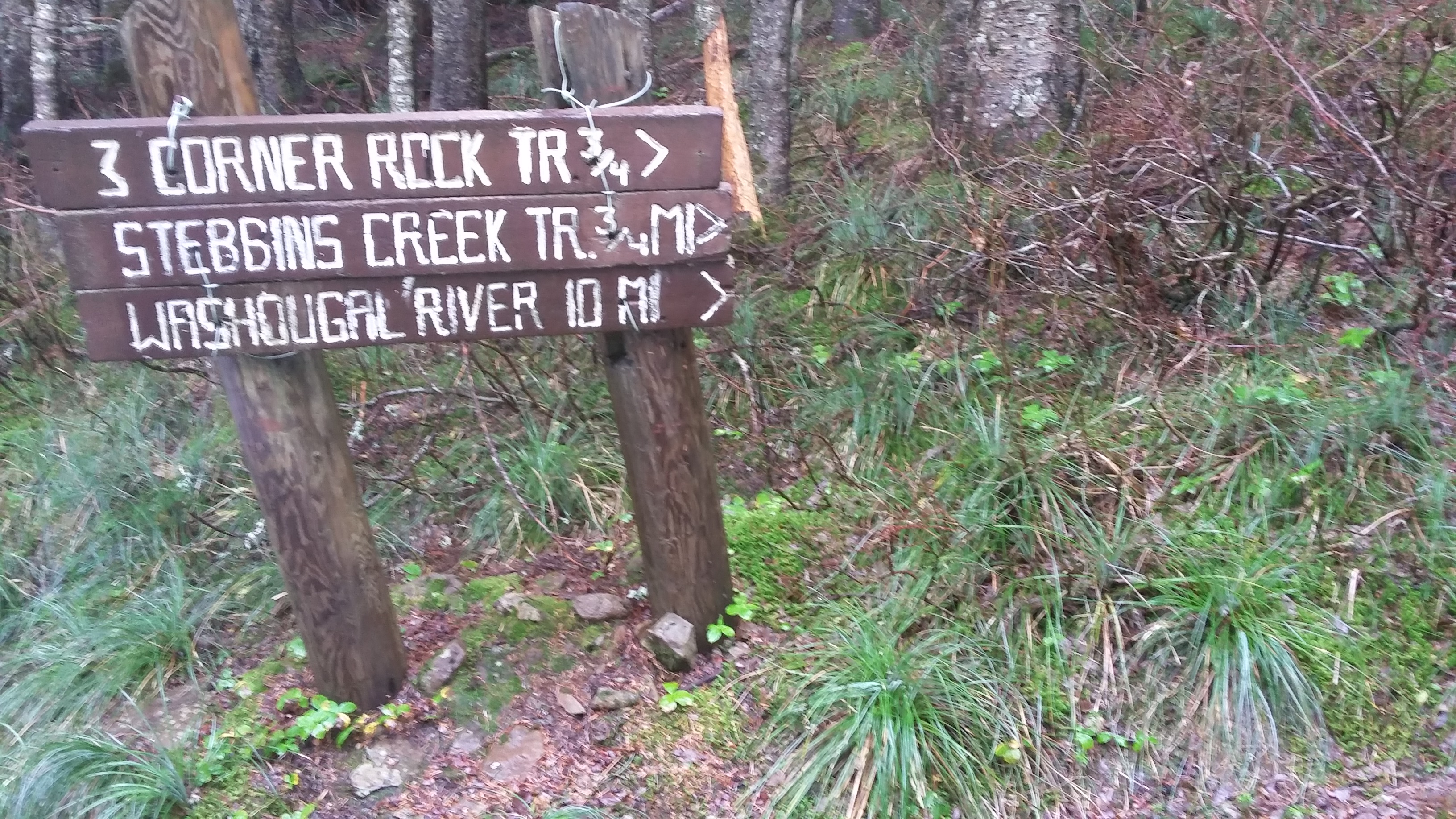 Take the PCT south (right hand side) and head up, eventually through several switchbacks about 1.5 miles to a right turn. The sign pictured below is large and obvious, but it is sometimes knocked down. Take this Three Corner Rock trail about 0.5 mile to a rough road where you will go right again and very shortly come up to the summit.