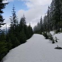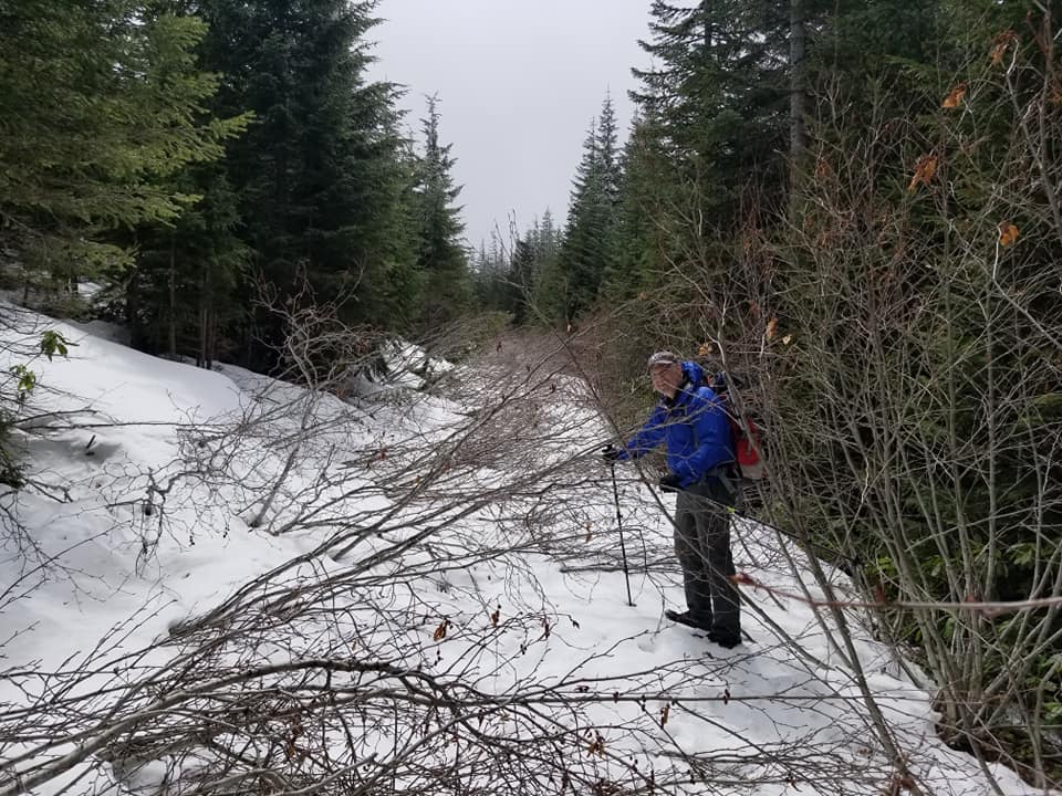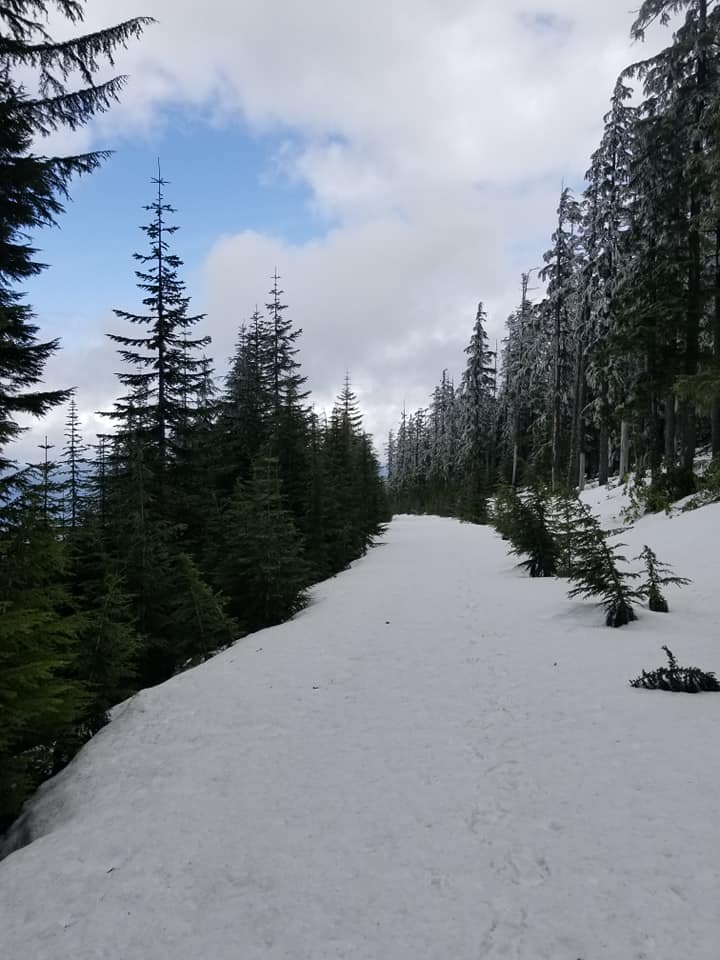 We were successful following the directions of our GPS to take us right to the gate. Head about 15 miles on Highway 224 east of Estacada to Fish Creek Rd. (Note that you DO NOT get to Fish Creek Mountain W7O/WV-015, via Fish Creek Rd.) You'll cross a bridge and travel along Fish Creek for about 1.8 miles and then the road (FS 5410 and FS 5411) heads uphill for 8 miles to a large landing where four roads meet. From here it's about 2.1 miles to a gate where you can park - however, in late April we found several feet of snow on the road and walked that distance. For your nicer vehicles, you may find the road a bit narrow in places, so walking before you get to the gate may be a good choice. From the gate the summit proper is about 0.7 miles - we found it quite overgrown, although it might eventually be cleared so that the RF site at the top can be maintained. We've not experienced any QRM issues from this site.