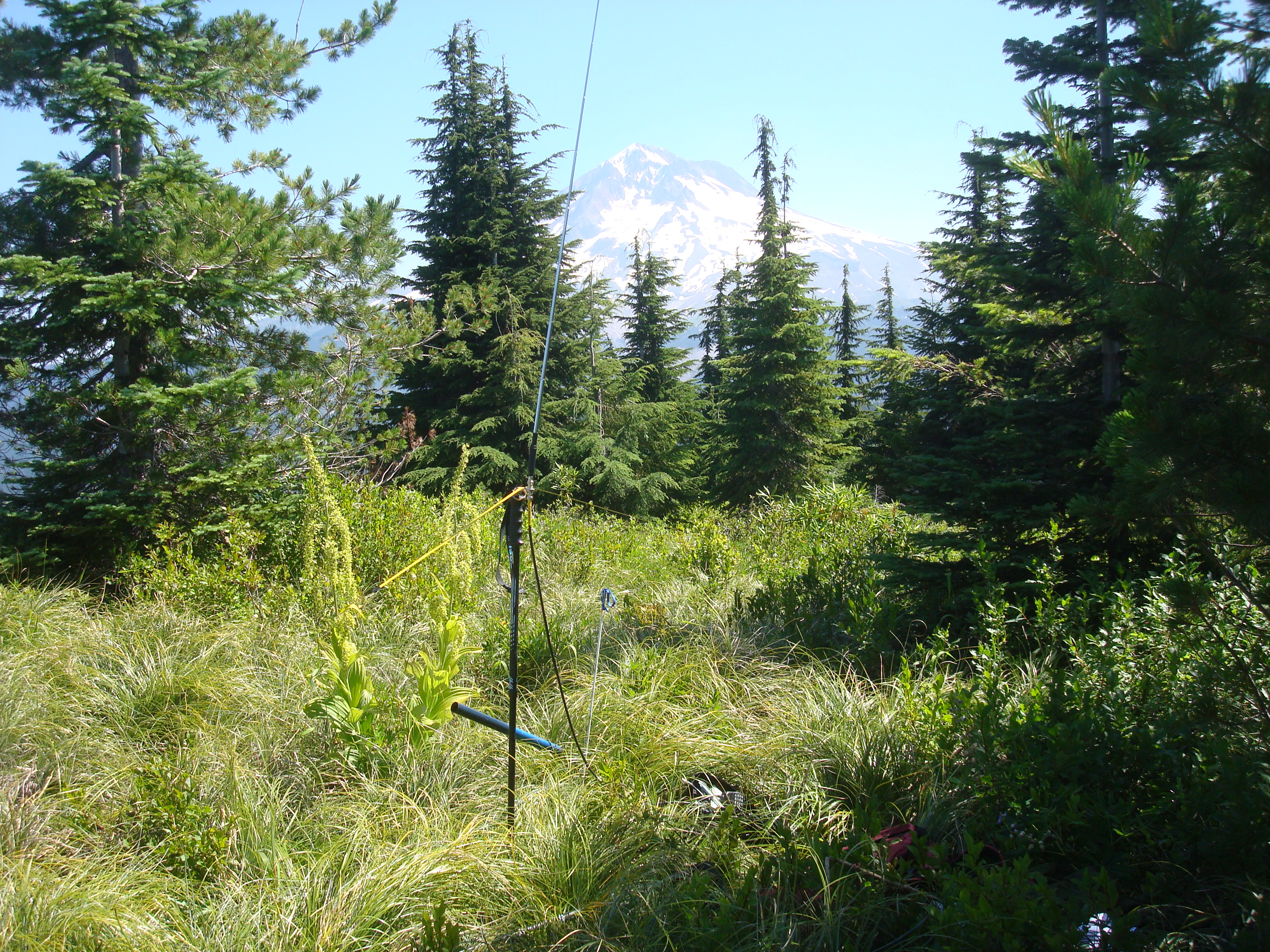 Here is where a GPS will be very useful (and you did record waypoints at the parking lot and trail junctions, right? And the coordinates for the summit proper?). As the ZigZag Mountain Trail comes closer and then moves away from the peak you can decide how you want to approach the summit itself, The trail is still several hundred feet below the summit and outside the activation zone. I marked a waypoint where I left the trail and proceeded up through the brush to the summit. Perhaps this is another place you’d want long pants – I gathered several nice scratches on the way up and back. There may a climber's trail to the summit, but I found no evidence of one and elk aren’t great at maintaining trails. The summit is worth visiting as it is open in most directions and has a spectacular view of Mt. Hood. There are a number of trees on the perimeter that could be used for antennas.
