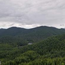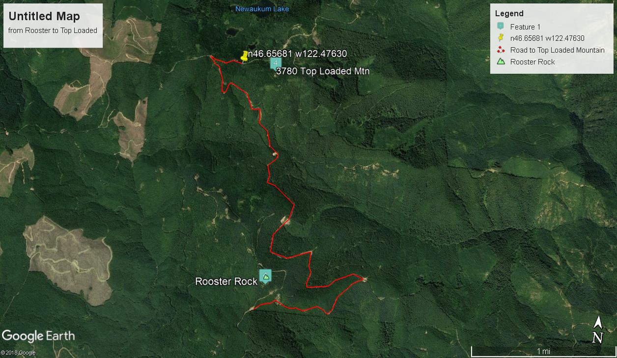 After activating Rooster Rock make your way back to NF-71 from the gate and turn left.  Follow NF-71 for roughly 4 miles to N46.65681 W122.47630. There will be a road to your right that leads to the summit.  Road could probably be driven up to summit but we parked and hiked up.  It's less than half a mile hike.
