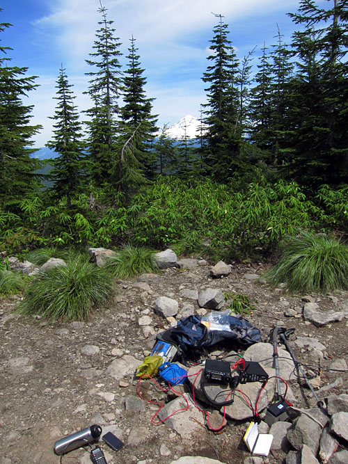 I forgot my hang bag so I strung out my dipole horizontally at around 8 feet. There are some large trees to hang from that circle the open spot at the top (see picture below). On HF I was running my Yaesu 857-d with ldg tuner and a g5rv-jr off a 12v 7.5 ah slab. I also had my HT running on battery with slim jim on VHF. I could hit the ARRG Mt. Hood repeater, but no one answered. I tried for a contact on 146.520, someone heard me, but they were mostly static on my end. On the HF side I could hear plenty of folks, but only had the one contact with AB7YL on 40m- thanks for the contact!