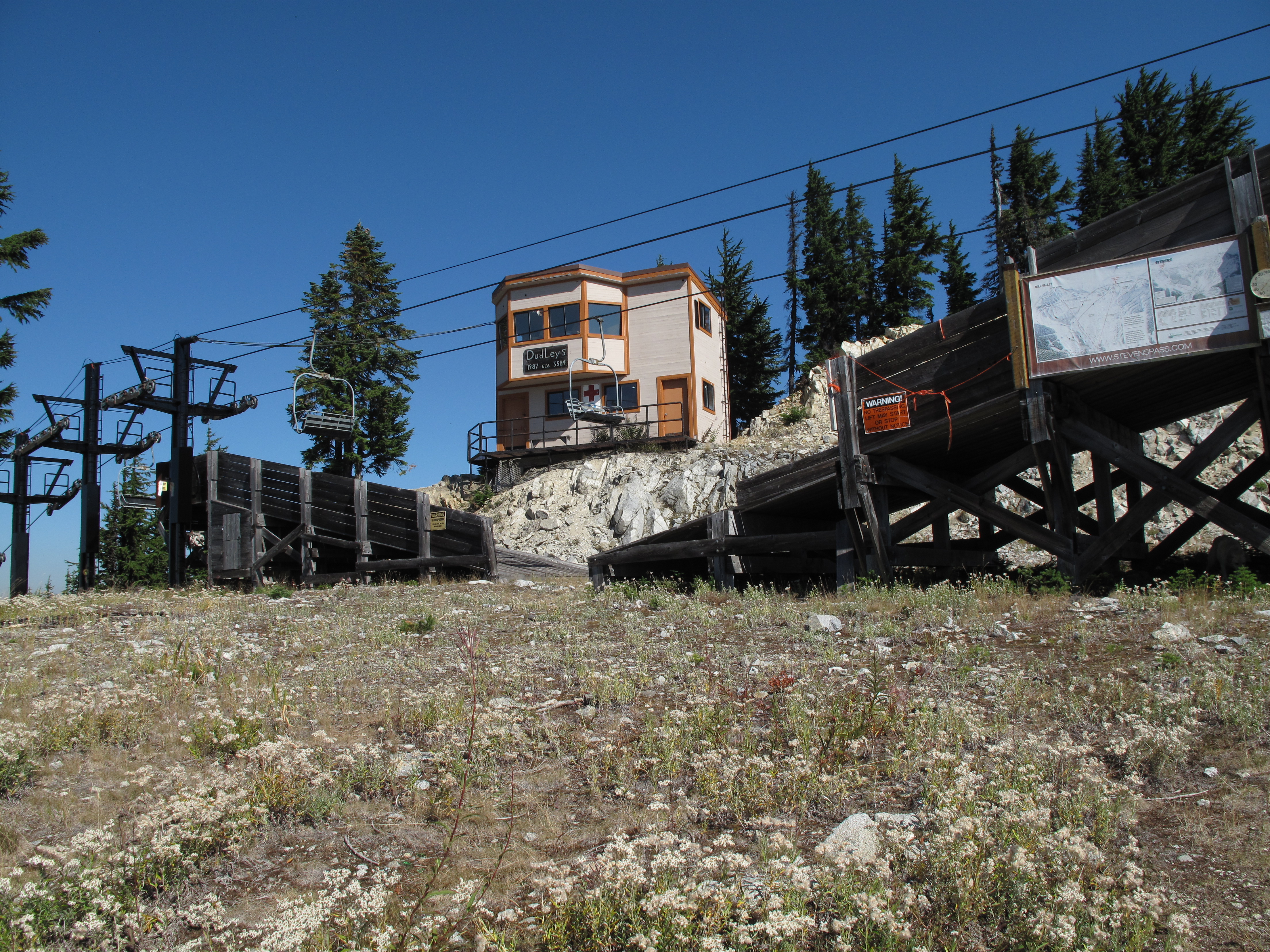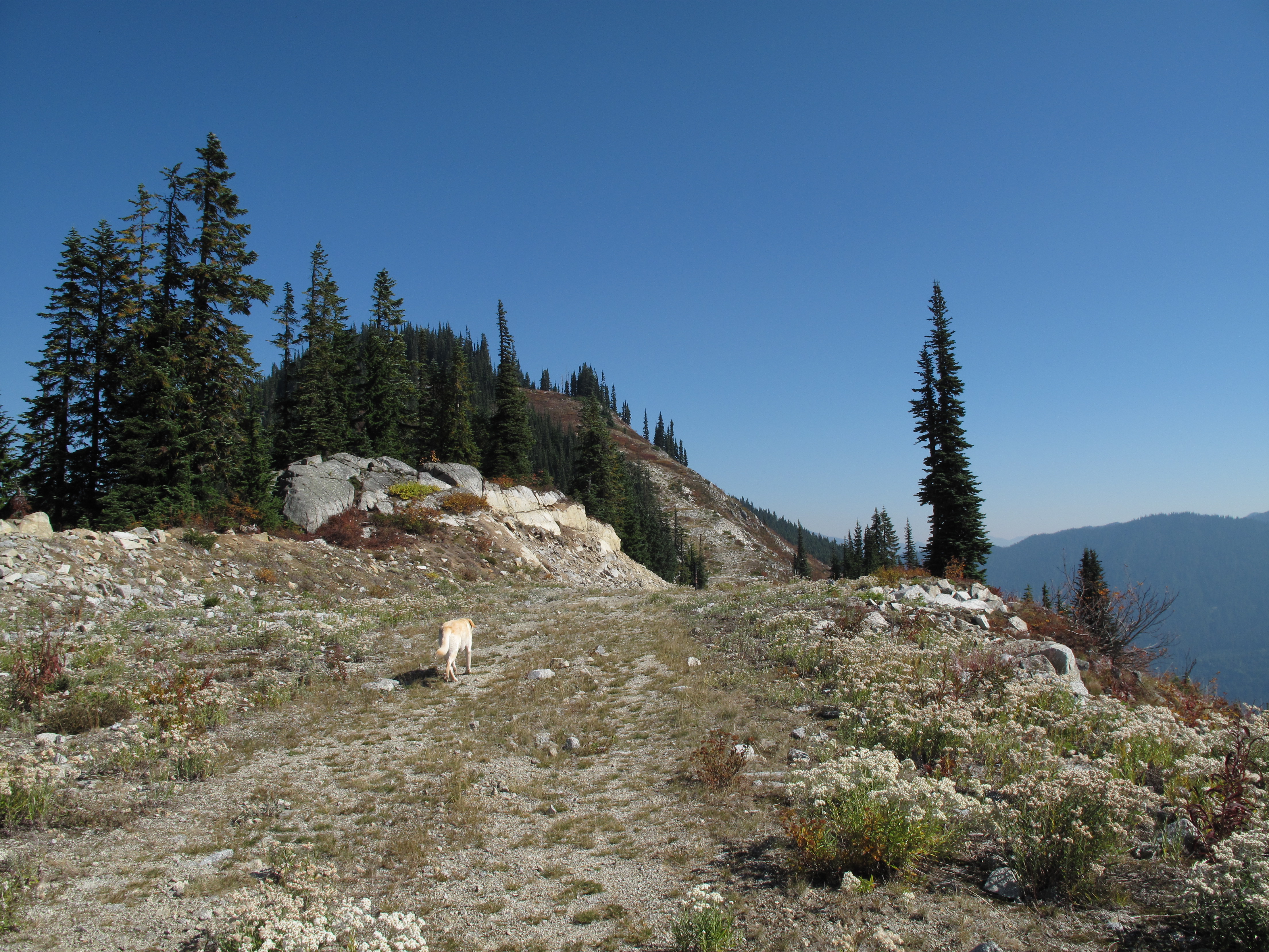 After approximately 2 miles on the PCT, reach the crossing of the long ridge defining the upper boundary between the main ski area and the backside slopes descending to Mill Creek valley. This is a very obvious way point. Turn left, heading NNE and later NE on a mostly well-defined boot beaten path towards the summit of Big Chief. Along the way you will cross under the double terminus of Southern Cross chair coming up from Mill Creek valley, and the Big Chief chair (old name) coming from the front side of the mountain. This point is at approximately 5,584 feet. From there continue on the boot beaten path nearly over point 5,765, descending a bit trough some boulder fields and steepish terrain (max class 2), and then a final beautiful section of open ridgetop terrain to the summit. This last section, from 5,765 to the summit is entirely out of sight of the ski area, and so has a more "wilderness" feel to it. On this section we were startled by 3 grouse taking sudden flight just a few feet from us. We also saw signs of deer, elk and coyote along this section of the ridge.