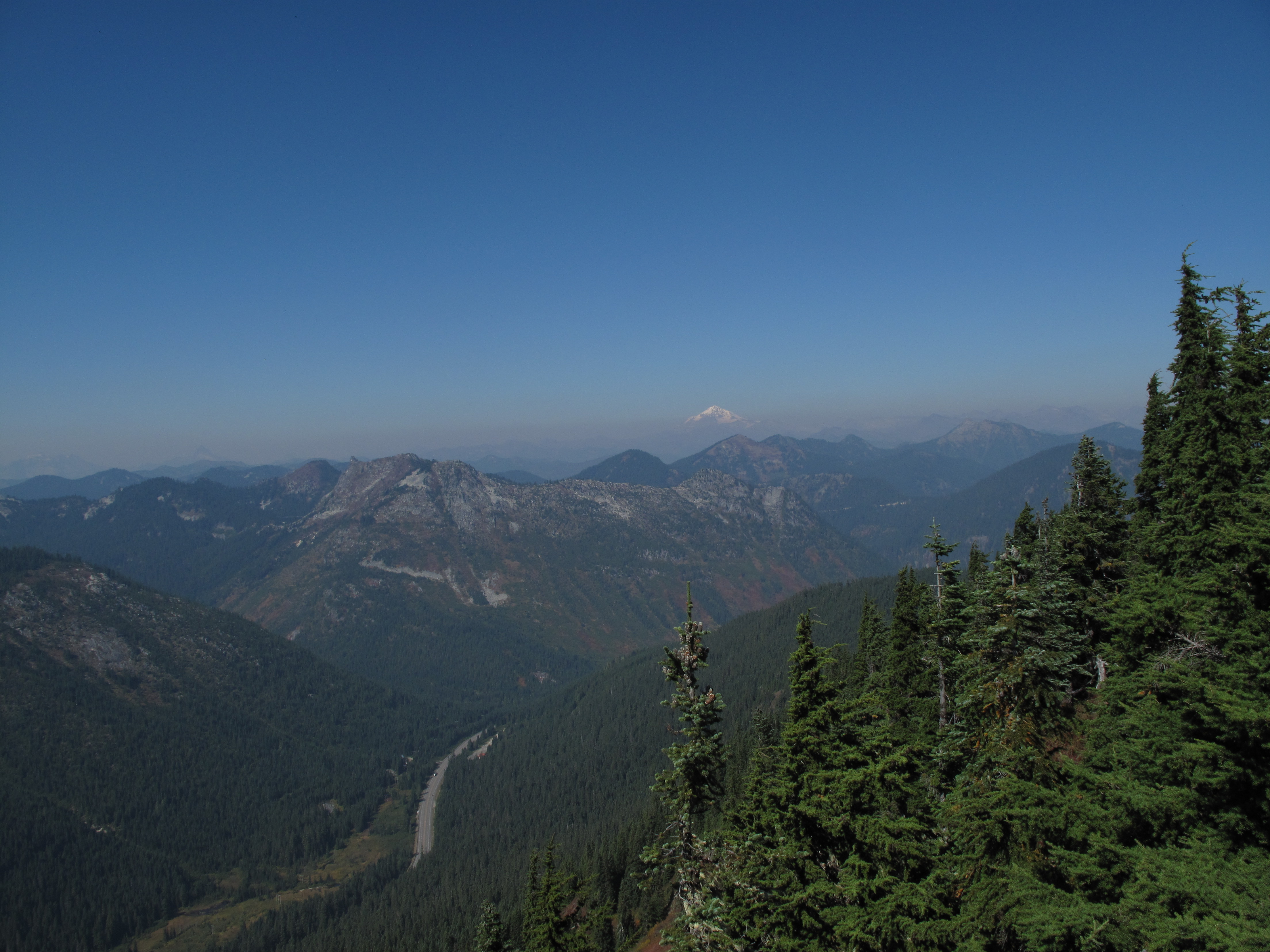 The summit is a smallish rock hump, with outstanding views in all directions! However, due to the ongoing forest fires in Eastern Washington, the distant views were significantly affected by the smoke and haze. Looming to the North was glaciated and snow covered Glacier Peak (10,541 feet) and to the SE the mighty Mount Stuart (9,415 feet).