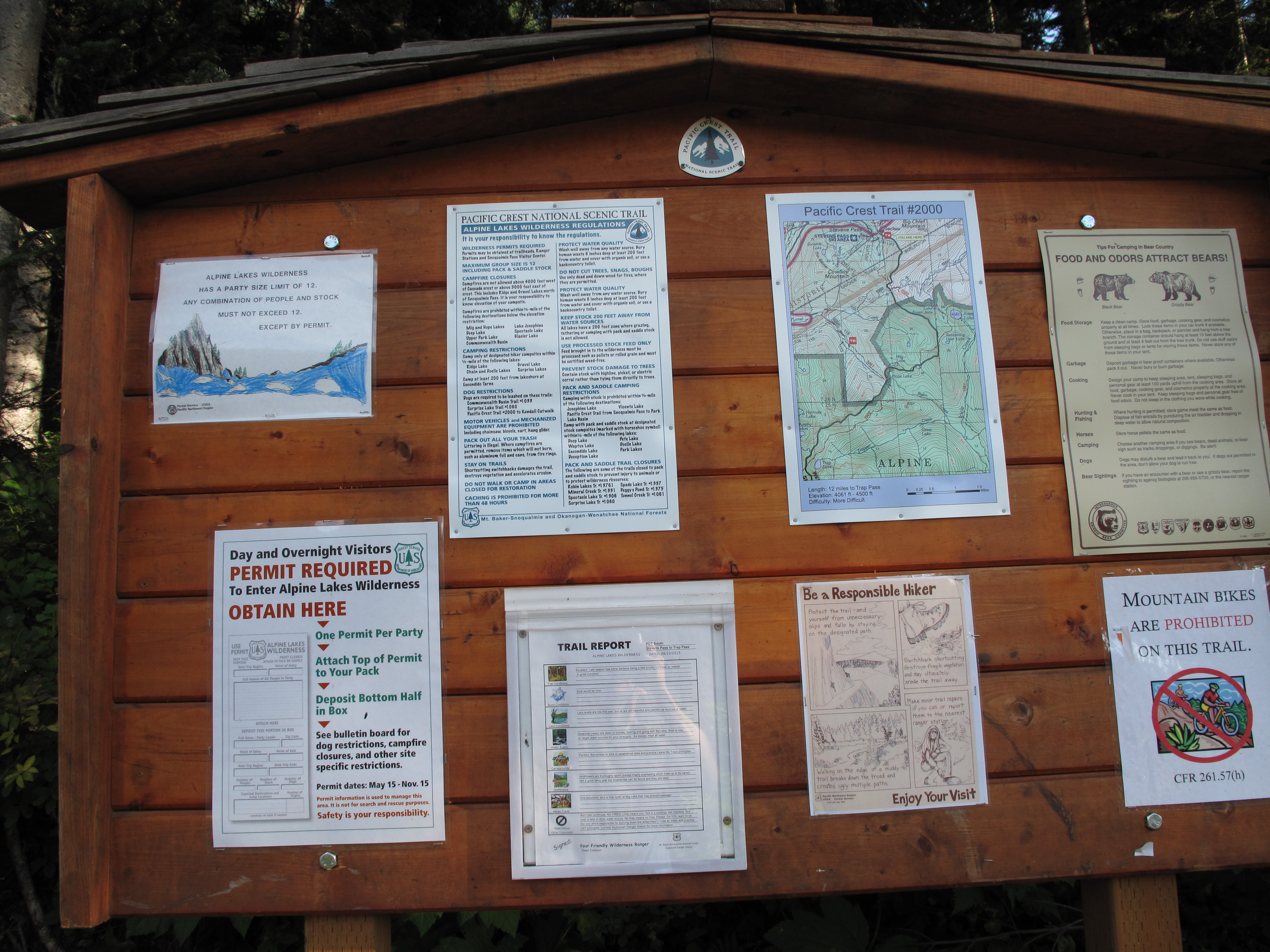 The trail access starts on the Pacific Crest Trail section Southbound from Stevens Pass to Snoqualmie Pass, and so affords an opportunity to meet and speak with Through Hikers doing the entire PCT, especially in the late Summer / early Fall. The route begins by travelling on the well graded PCT, South from Stevens Pass. The TH is found in a large gravel parking area east of all of the main lodges at the ski resort. The actual TH sign is about 100 lineal feet above the gravel parking area. See picture of TH sign. Travel about 2 miles on the well graded PCT, at first through the more visible portions of the ski area, and then through very pleasant and wonderfully colorful (Fall) forest. On occasion passing under the Big Chief chair (old name) and later the Tye Mill Chair of the ski resort.