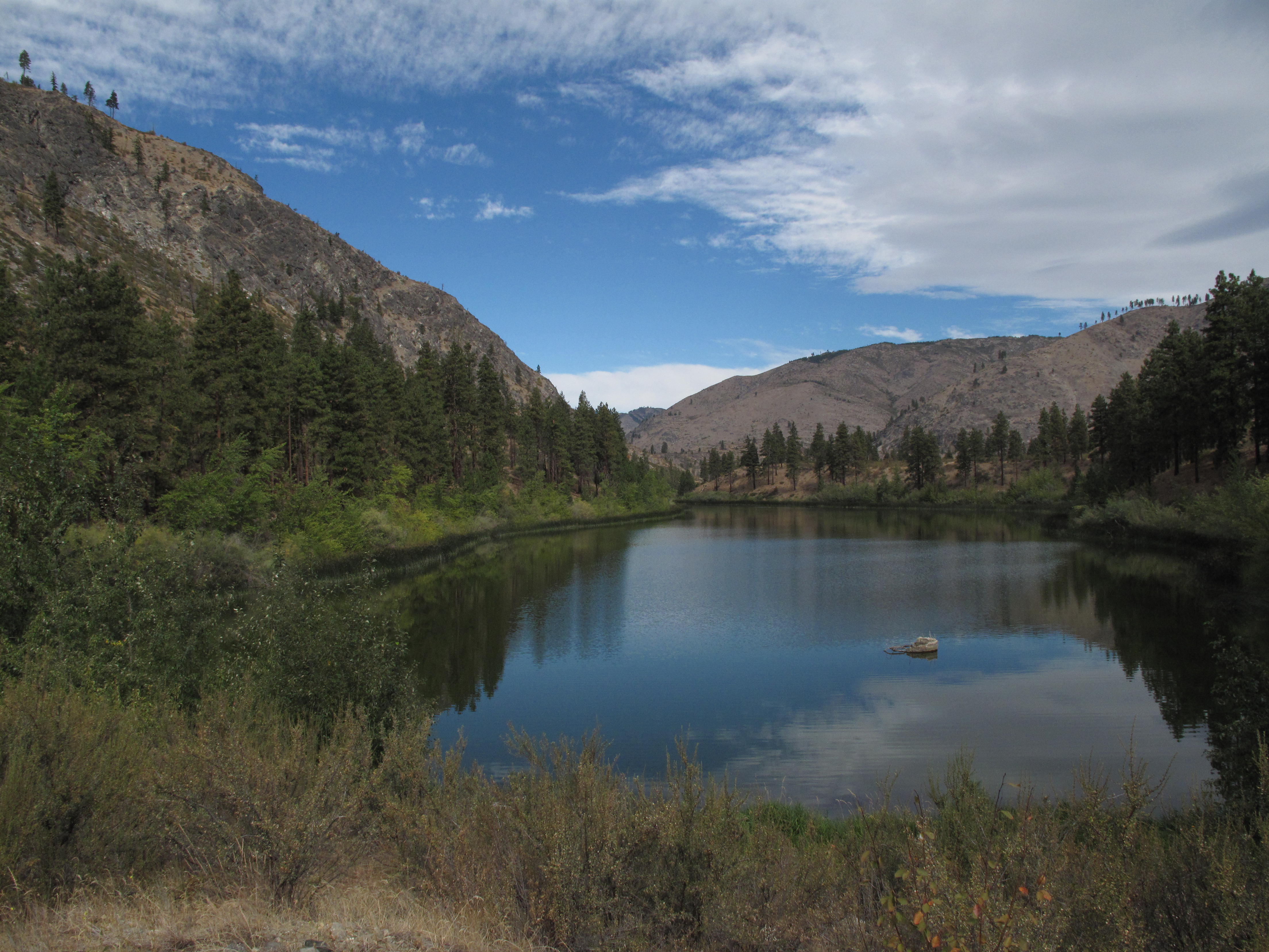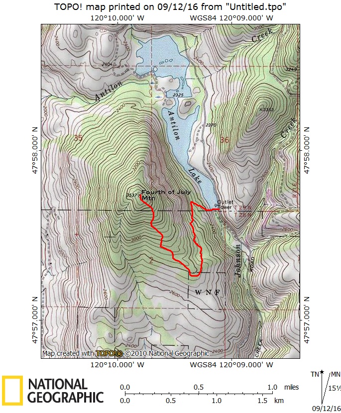 Access to Fourth Of July Mountain is from the small town of Manson, which lies on Lake Chelan, about 5.5 miles WNW of the town of Chelan.  From Manson, the mountain is approached from Upper Joe Creek Road and then Grade Creek Road, AKA Wenatchee National Forest Road 8200.  Drive towards Antilon Lake, a reservoir maintained by the local water authority.  Park right above the earthen dike forming Antilon Lake.  Drop down to the dike, approximately 15 feet, and cross it towards the mountain.  On the far side of the dike, find a trail starting up to the right (northwest).  The trail, rough and indistinct in spots, more or less goes to the top of the mountain, switchbacking first up the east face of the mountain towards the SE shoulder, then ascending the SE "rib" of the mountain.  The trail does not show on any maps that I researched, but is definitely the best and easiest way to the summit. See map & photos.  Our route was approximately 2 miles each way, gaining approximately 1,200 feet.  I would suggest the best time of year to do this activation is Fall or Spring.  I would also suggest an early morning start, as the trail is mostly in open east and south exposed slopes, and would be hot as Hell in the summer.