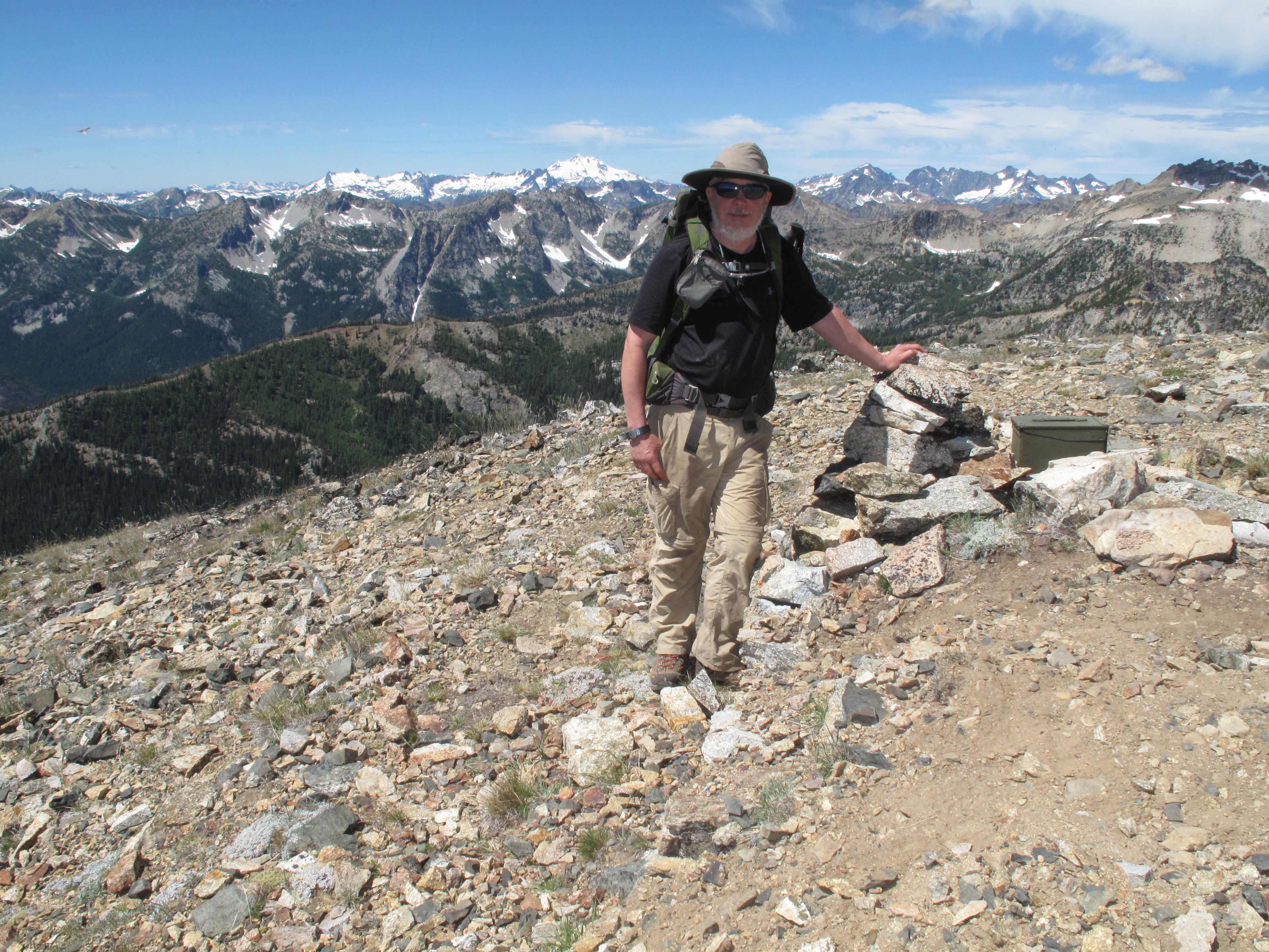 Chelan Crest SOTA Outing July 23-25, 2016 – Part 4. See separate reports on PNWSOTA website with background on the entire outing and day 1 & 2 description, with 3 other First SOTA Activations. The total trip was approximately 25 miles RT, with approximately 7,000 feet elevation gain, including ups and downs in between the various peaks. This is report 4 of 4, "Pyramid Mountain". Pyramid was the apex of our 3 day 2 night SOTA outing, both in elevation and distance from the TH. This 10 point SOTA Summit is 8,245 feet high, and affords some fantastic view of the Central and North Cascades, Lake Chelan and Eastern Washington.