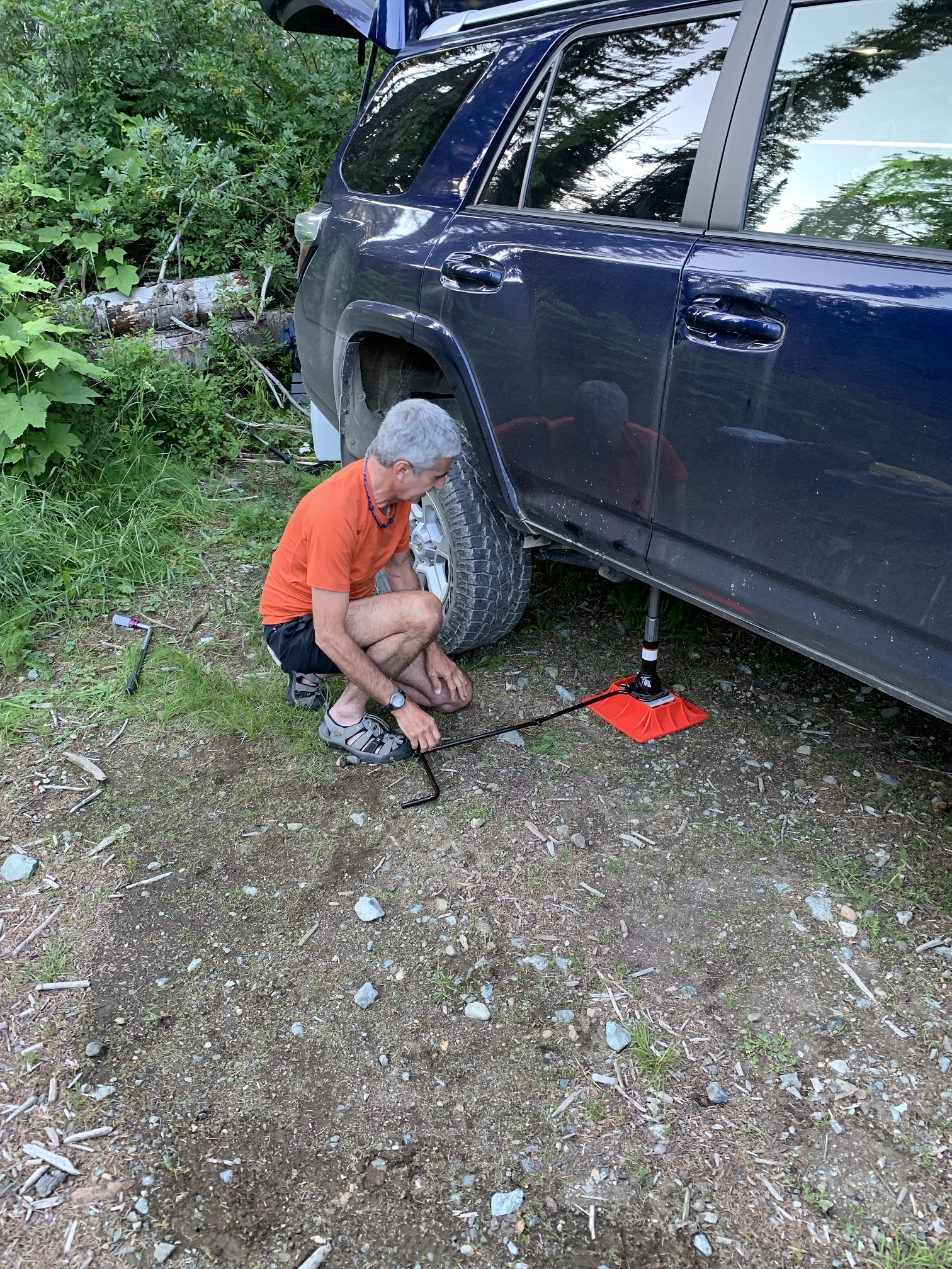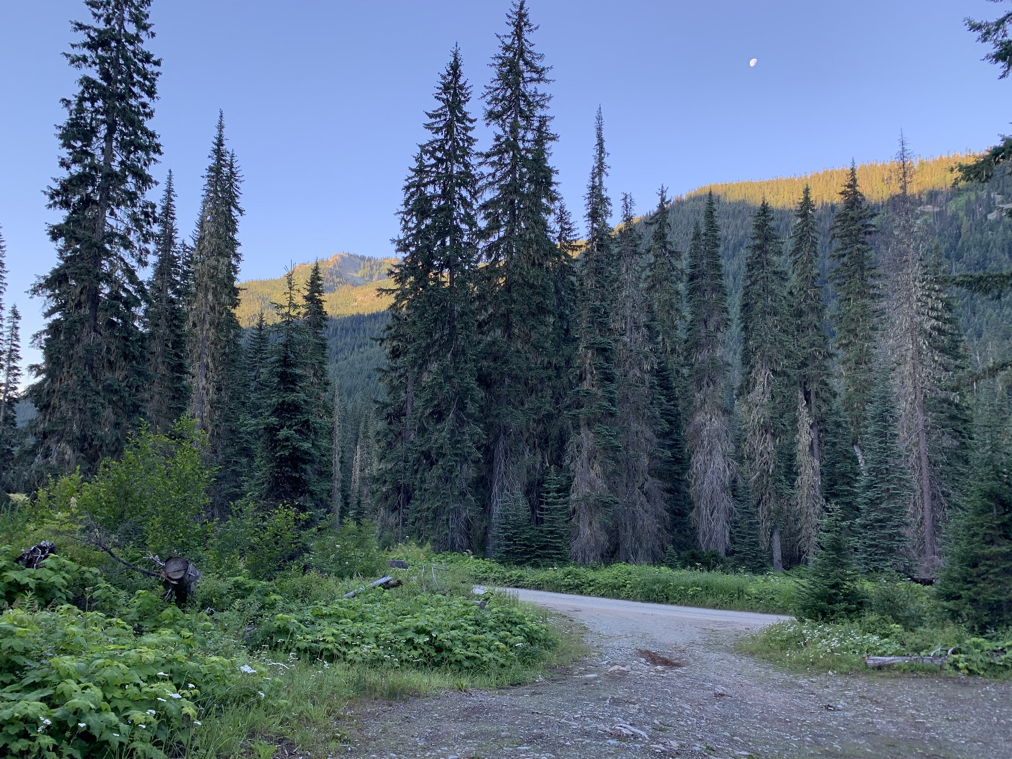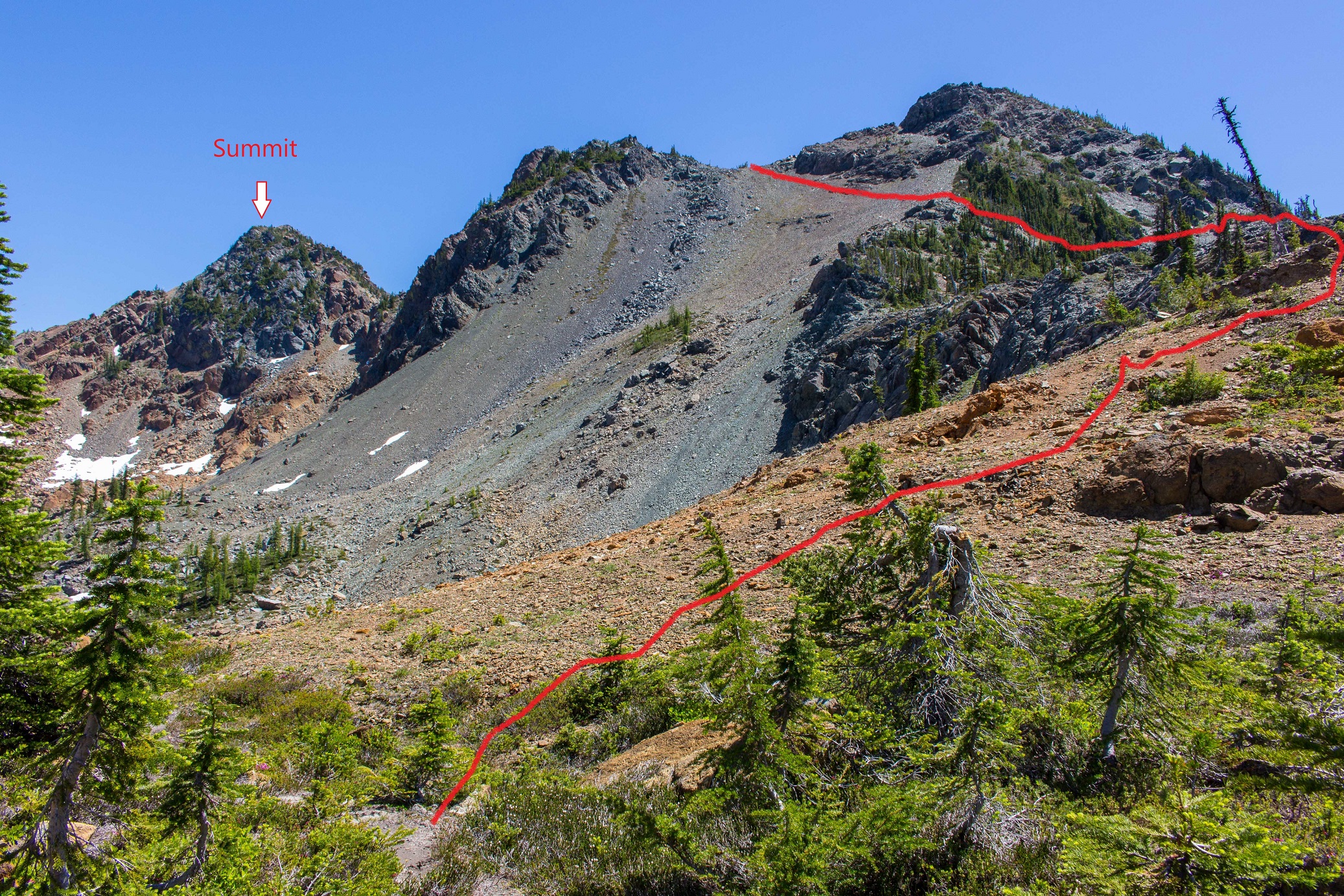 The Peak is accessed via the Paddy Go Easy Pass Trail.  See: https://www.wta.org/go-hiking/hikes/paddy-go-easy-pass .  The TH and parking can be found at: 47.5332, -121.0827.  To get to this location, drive approximately 31 miles from I-90 (Exit 80), mostly Northbound, on Bullfrog Road, SR903, Salmon La Sac Road (AKA Cle Elum River Road).  The last 16 miles or so are a rough logging / Forest Service road.  At mile 28.6 is the "famous" Scatter Creek Crossing, which can have water up to 1 1/2 feet deep, depending on season and snow melt.  We had no problems in getting to TH with Tim's Toyota 4Runner.  The drive from Bellevue took about 2 1/2 hours.  Unfortunately, we discovered the rear passenger tire had a leaking puncture.  The puncture was provided curtesy of a 2-inch auto body trim bolt, dropped along the rough road, along with other detritus, ejected from the cars driven by the Testosterone Crowd.  I saw several pieces of car body and trim along the way to the TH.  Tim made quick work of fixing the tire, and we had no problems driving it back home.
